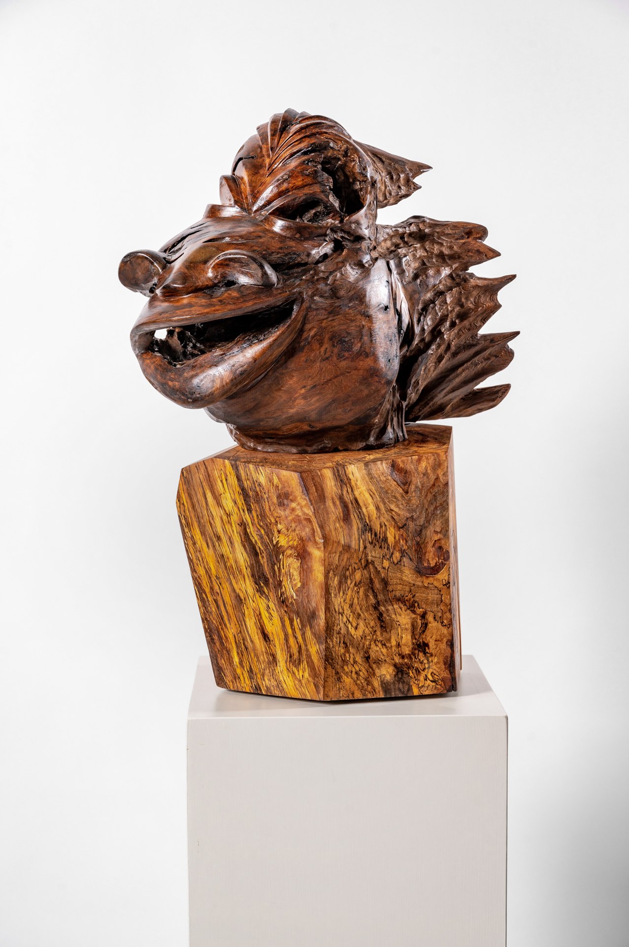A sinker cypress sculpture representing the spirit of water, with a spalted pecan base.