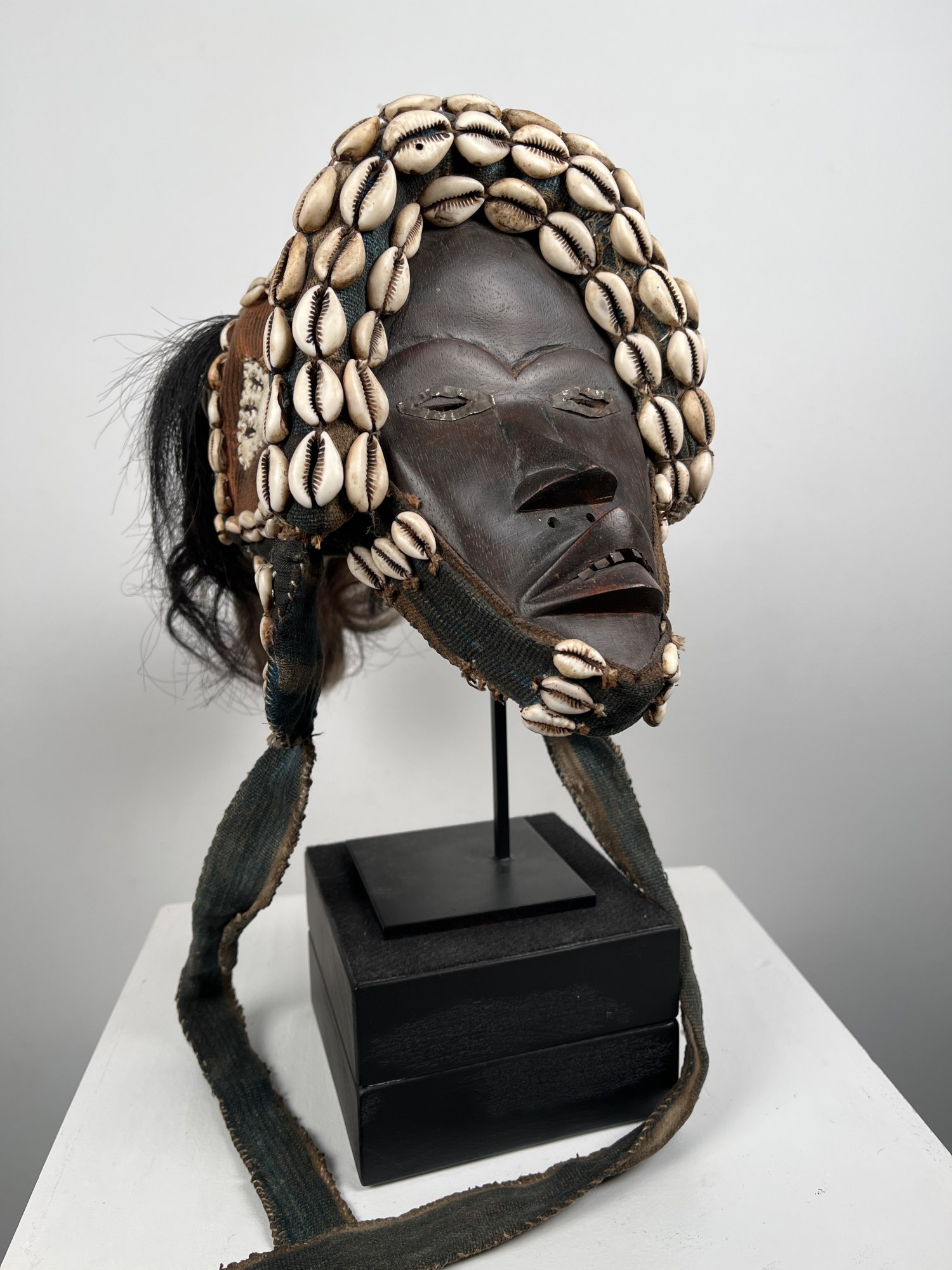 This mask is undoubtedly a recent version of a mask known as Ga wree wree. The narrow slit eyes designate that this is a female mask. The cowrie shells along the chin and forehead band indicate wealth and prestige. The conical extension also with cowries and animal hair beyond complete the mask.