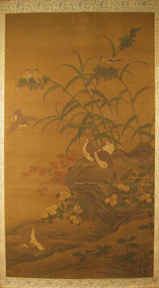 Darkened by age hand scroll; faint colors on silk, landscape with birds & flowers; 5 seals: one of the Emp. Ming-Ch'ang of the Jin -Chin Dyn. (1190-4) seals: unidentified.