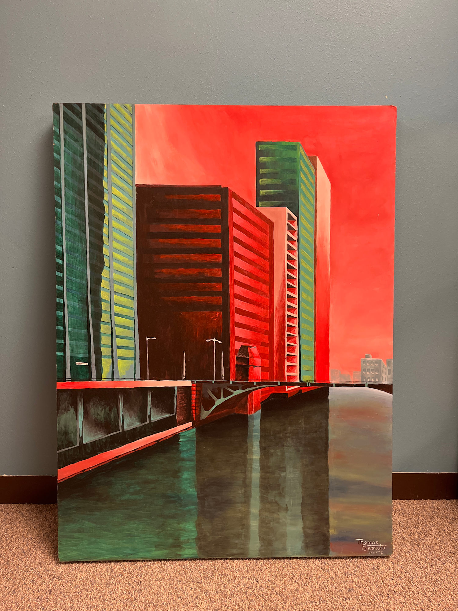 Downtown Chicago Scene on Chicago River in vivid reds & greens.