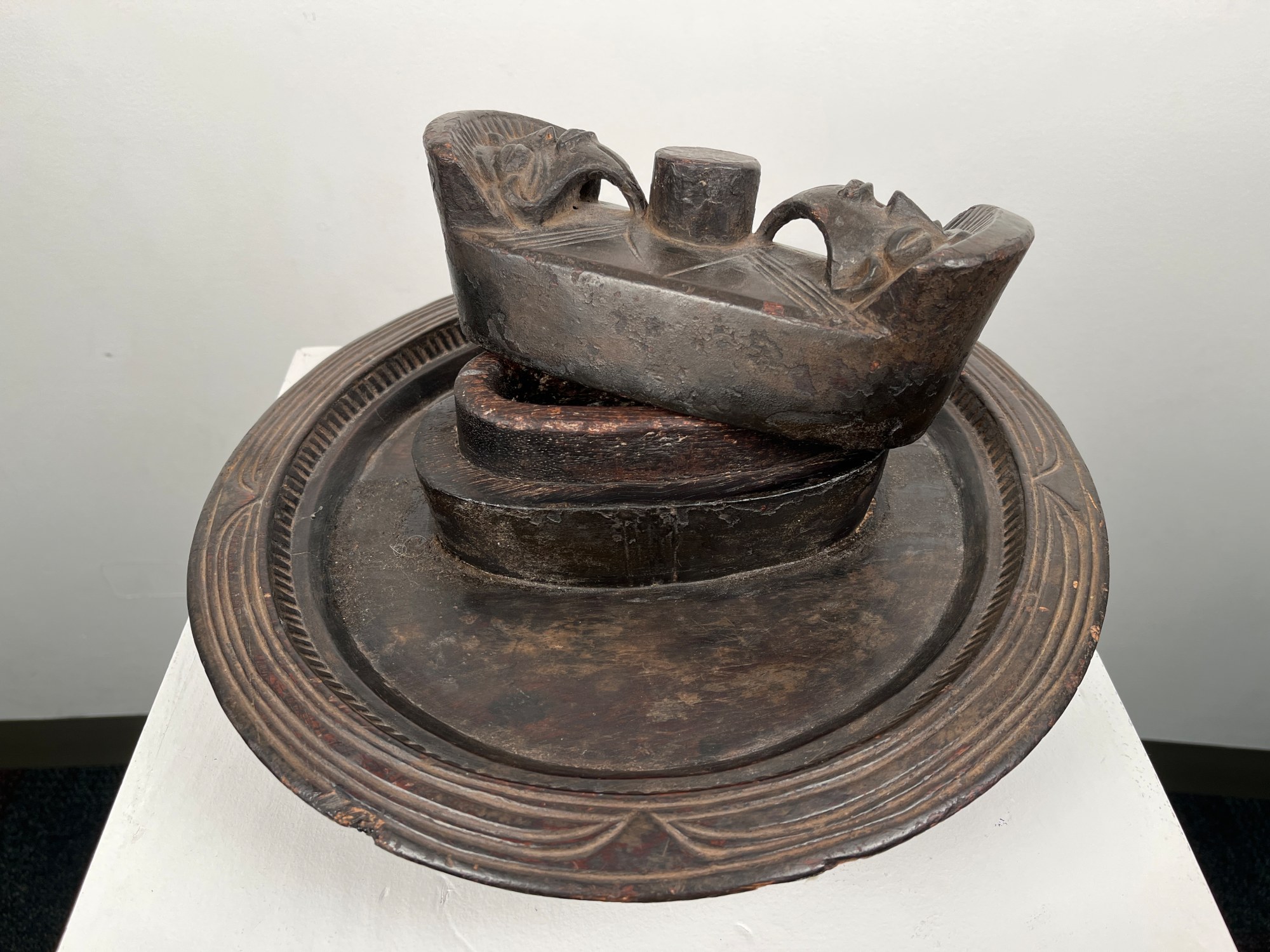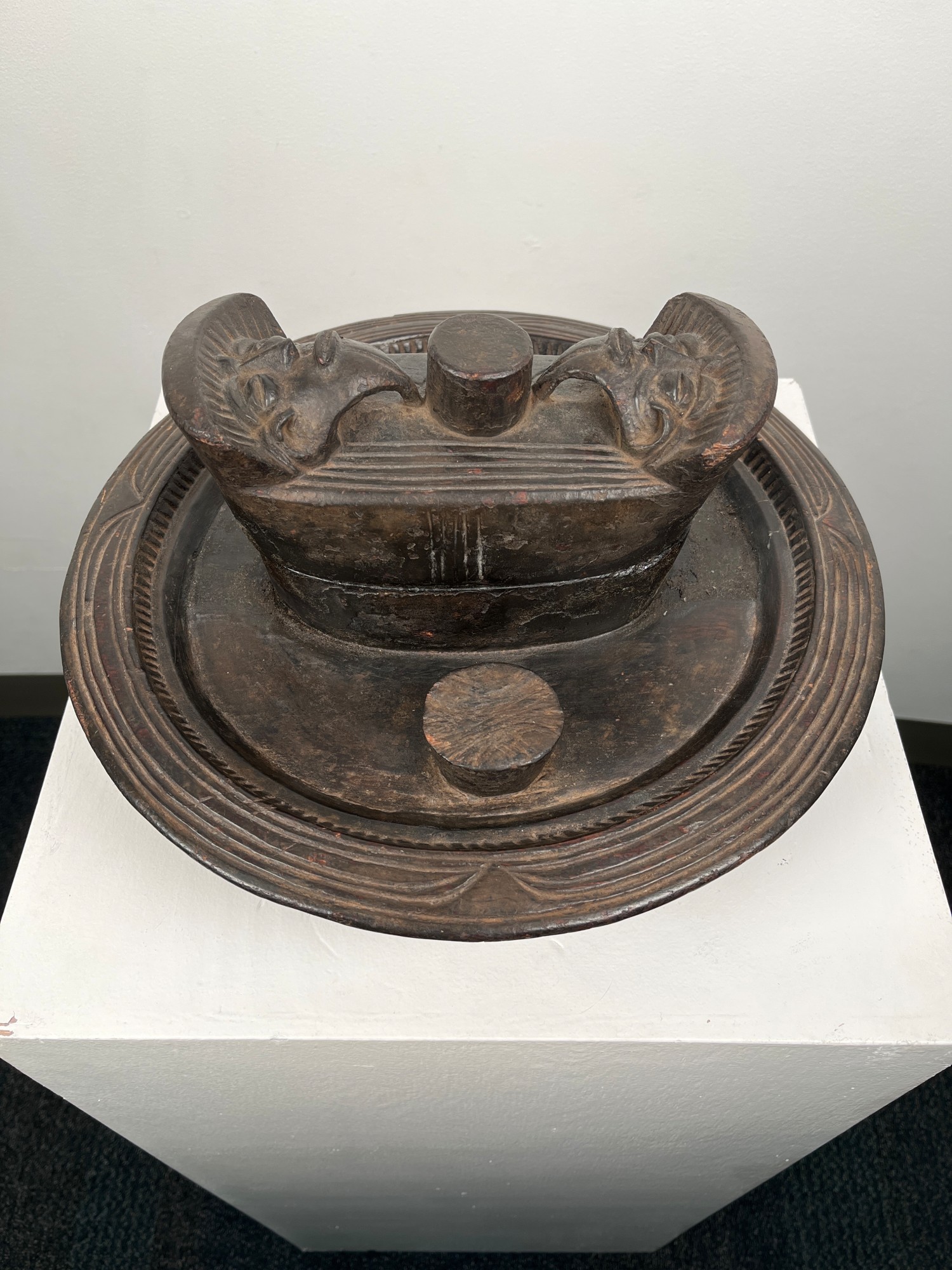 This bowl has a solid bottom with an oval-shaped container in the center on the top. The lid has two faces with beards attached to a knob. There is a knob on the side for cutting kola nuts. The bowl was used for hospitality purposes and for storing kola nuts and chalk.