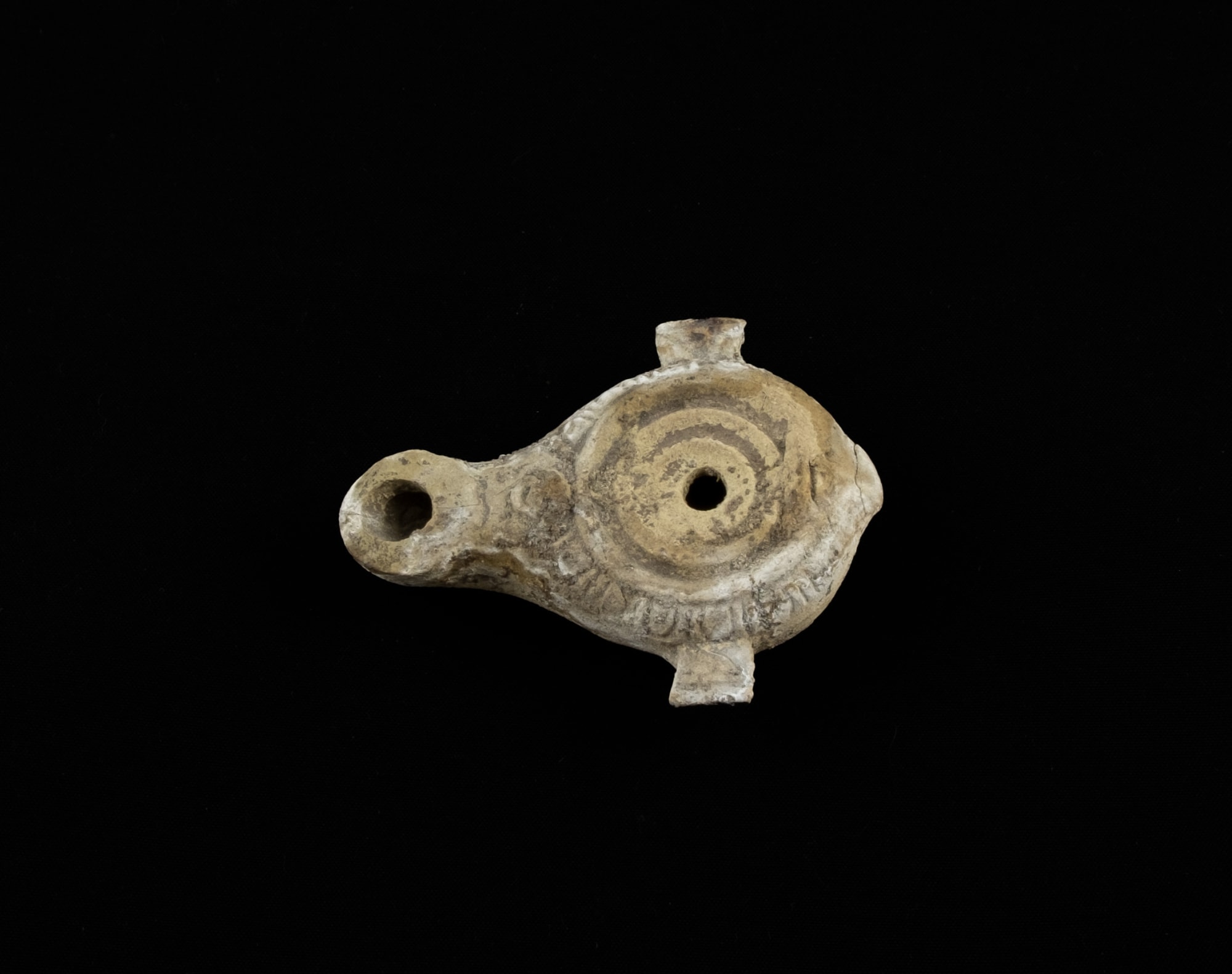 Small, white clay lamp with egg and dart pattern around top. Roman.