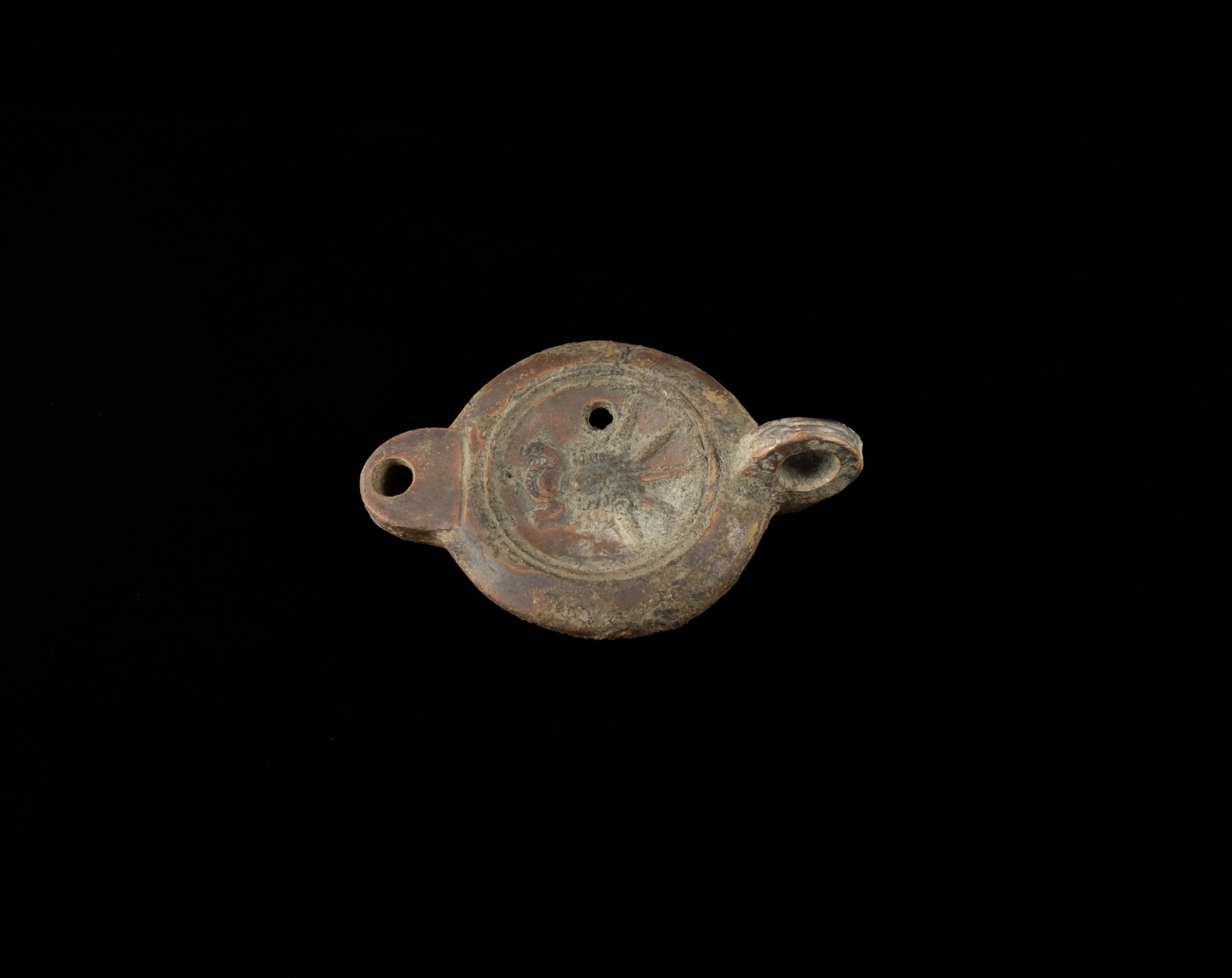 Brown varnished clay; ring handle. Discus decorated with bust of the sun god, Helios, with radiant crowned head, in molded relief. Potter's mark on the bottom. Roman.