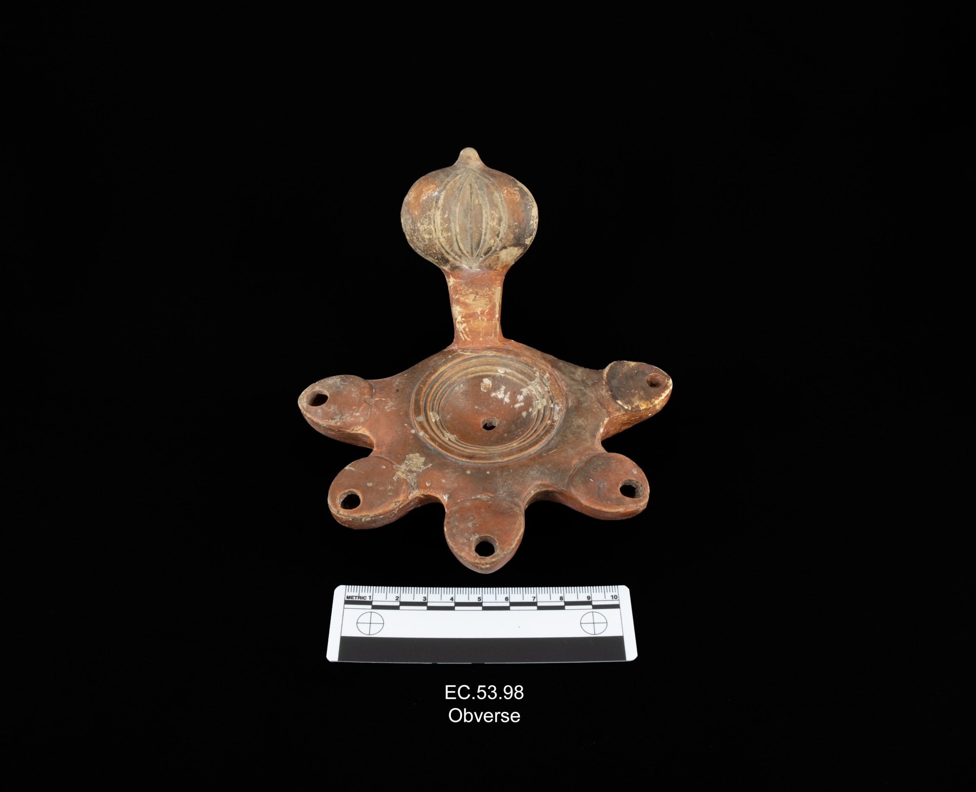 Red varnished clay. Fancy ring handle with acanthus thumb-piece. Five protruding nozzles. Circle in the center discus. Roman.