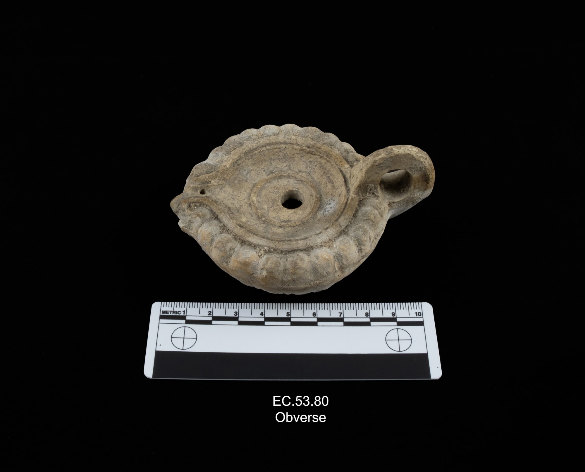 Light clay; ring handle. Raised circular decoration around edge. Inscription on bottom: L CAESAR (probably altered). Roman.