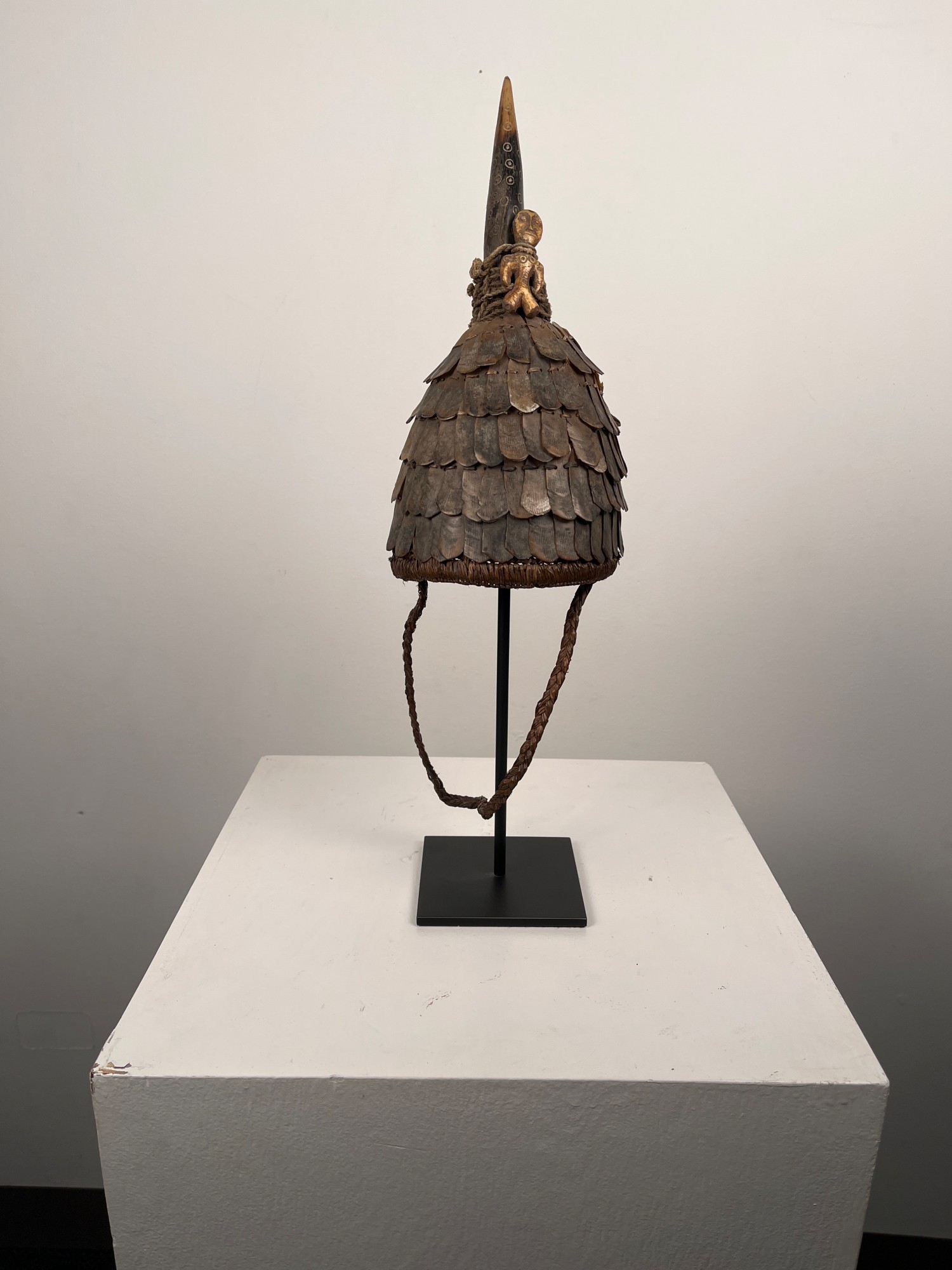 The had is a basketry woven conical shape covered in pangolin scales with a carved horn and ivory figure tied to the top. There is a braided fiber chin strap.