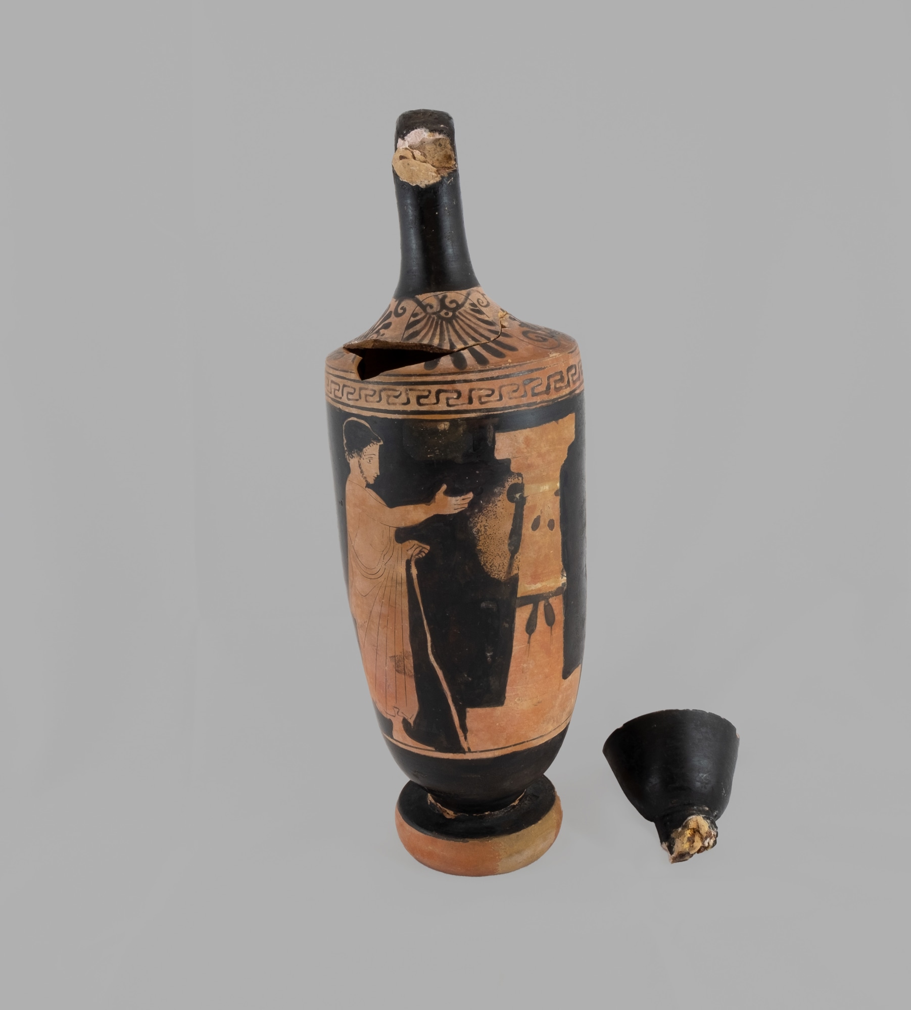 Youth, holding walking staff and draped in a himation, advances toward a large columnar stele, wrapped with black and white tainai. Classical Greek, Attica.