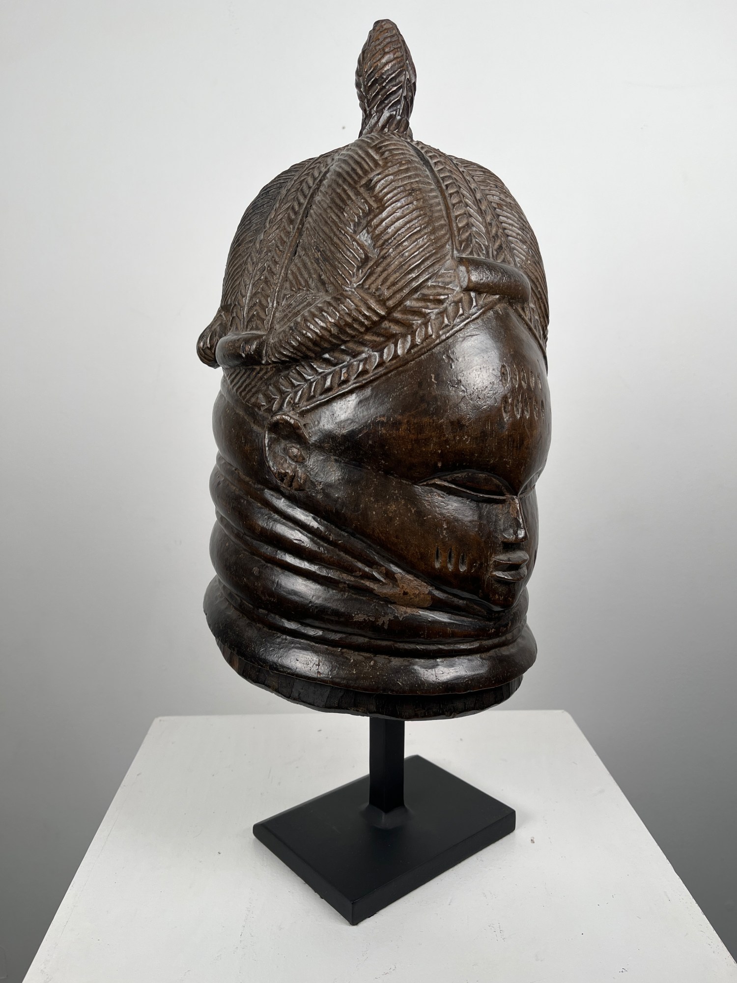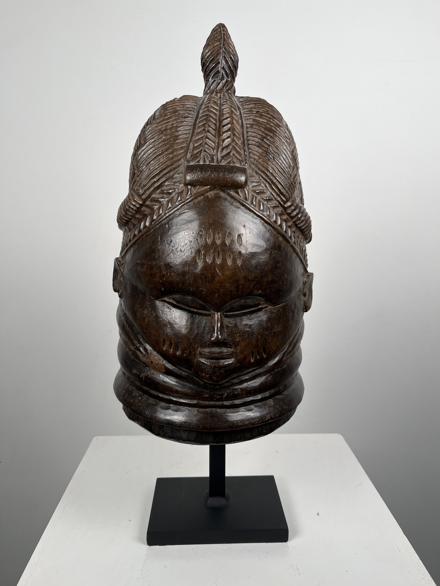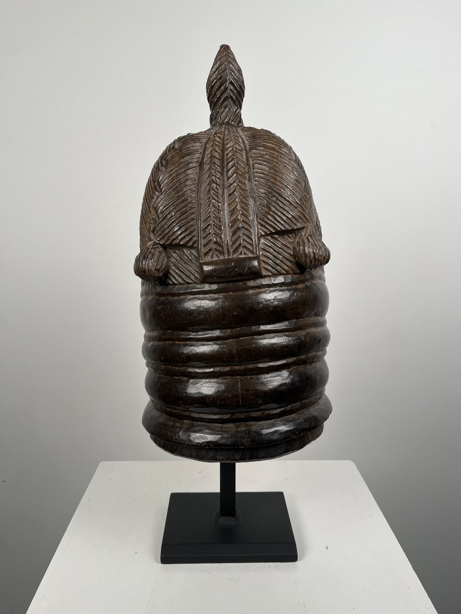 This is a mask of the Sande society of the Mende tribe of Sierra Leone. The hairstyle on these masks is usually divided into 4, 6, or 8 large lobes or buns arranged around the crown of the head. Normally the lobes are then braided or tied together in a small knot at the top of the head. According to Sieber and Herreman in Hair in African Life and Culture, the 4 lobed style as this one has, was most common before WWI and Since WWII the variations with 6 or 8 lobes have been more popular. These coiffures are often further elaborated by the addition of a plaited border at the hairline.
