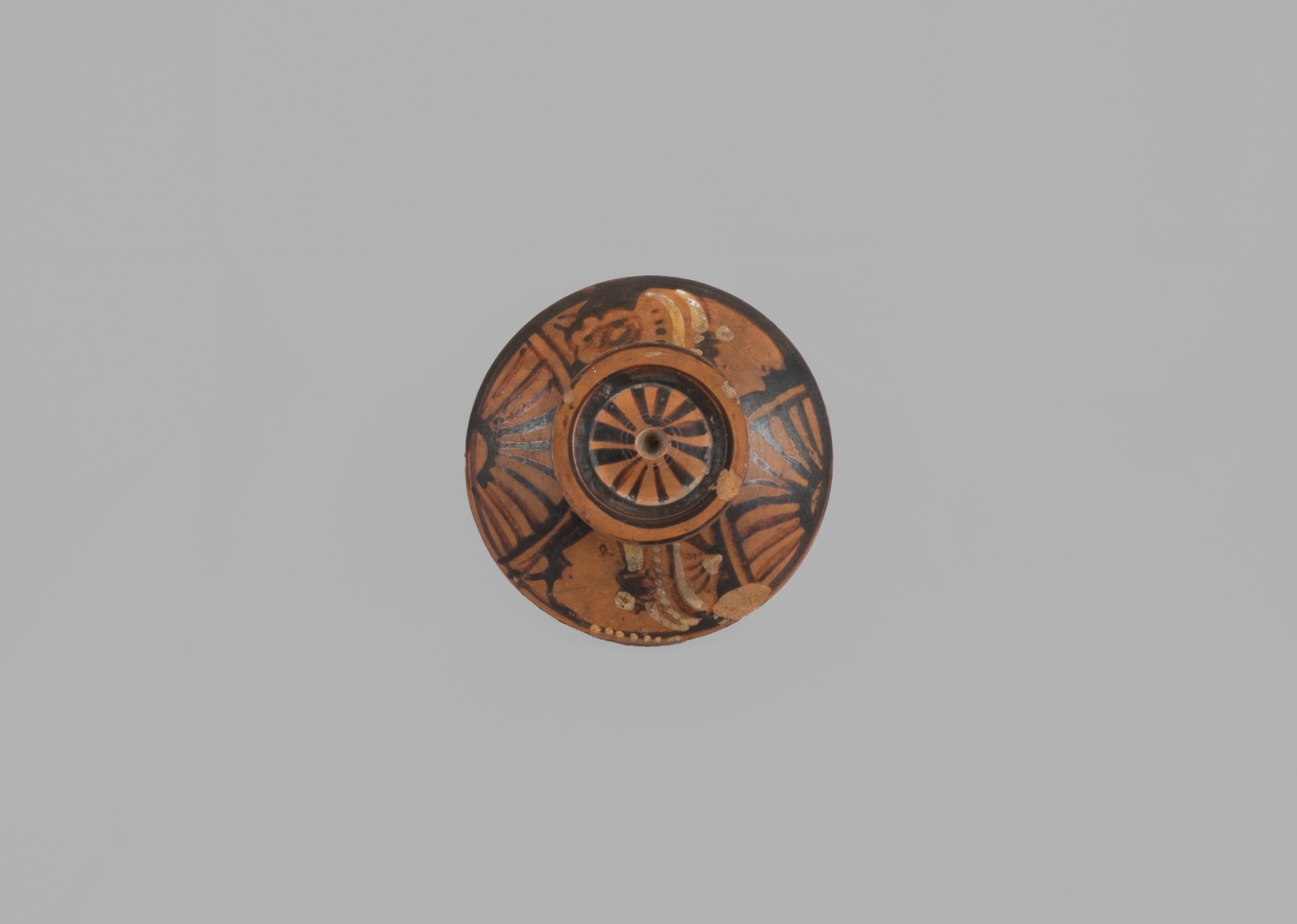 Two schematic female heads in profile, each wearing a saccos, with palmettes between them. Hellenistic, southern Italy.