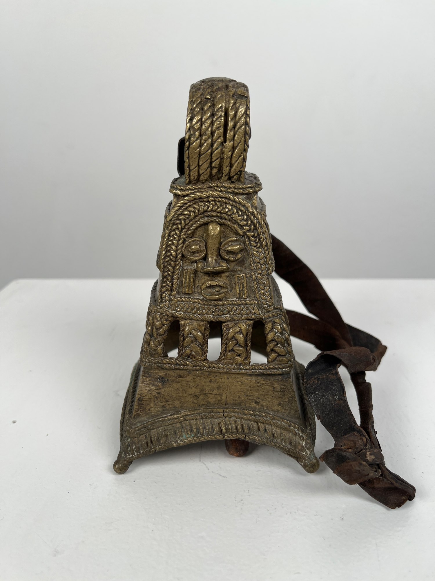 An obo brass bell of quadrangular form cast with a mask to one side and pierced with two registers of ropework, curved gadrooned rim within narrow ropework borders, ropework loop for suspension, minor damage to rim.