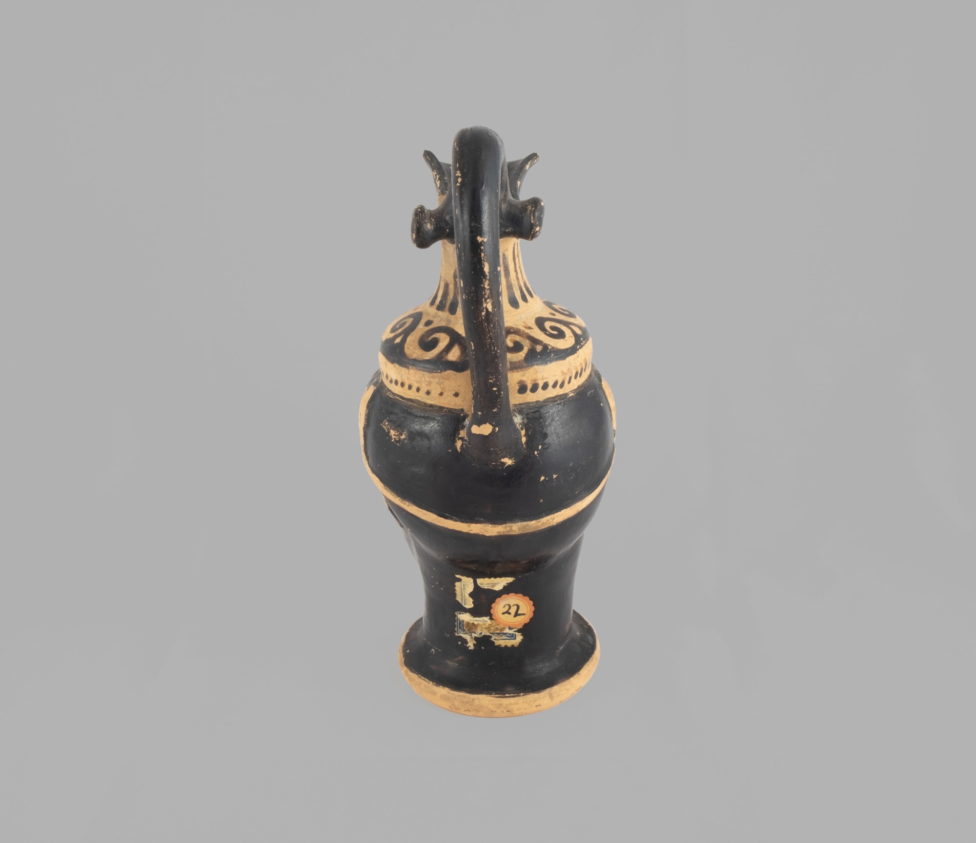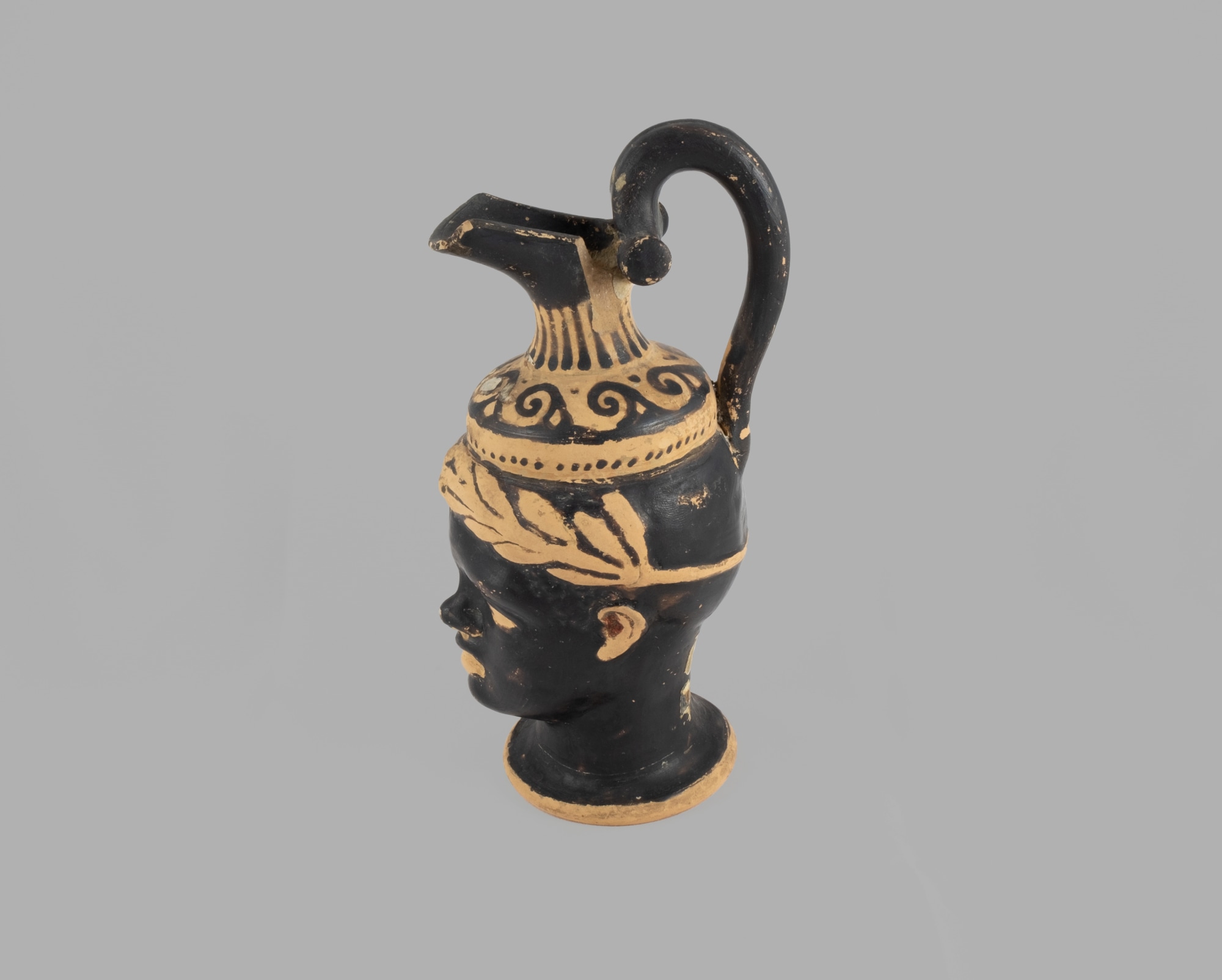 Plastic' vase in the form of a Nubian head wearing laurel wreath. Shoulder bears open wave meander. Late classical Etruscan, central or southern Italy.