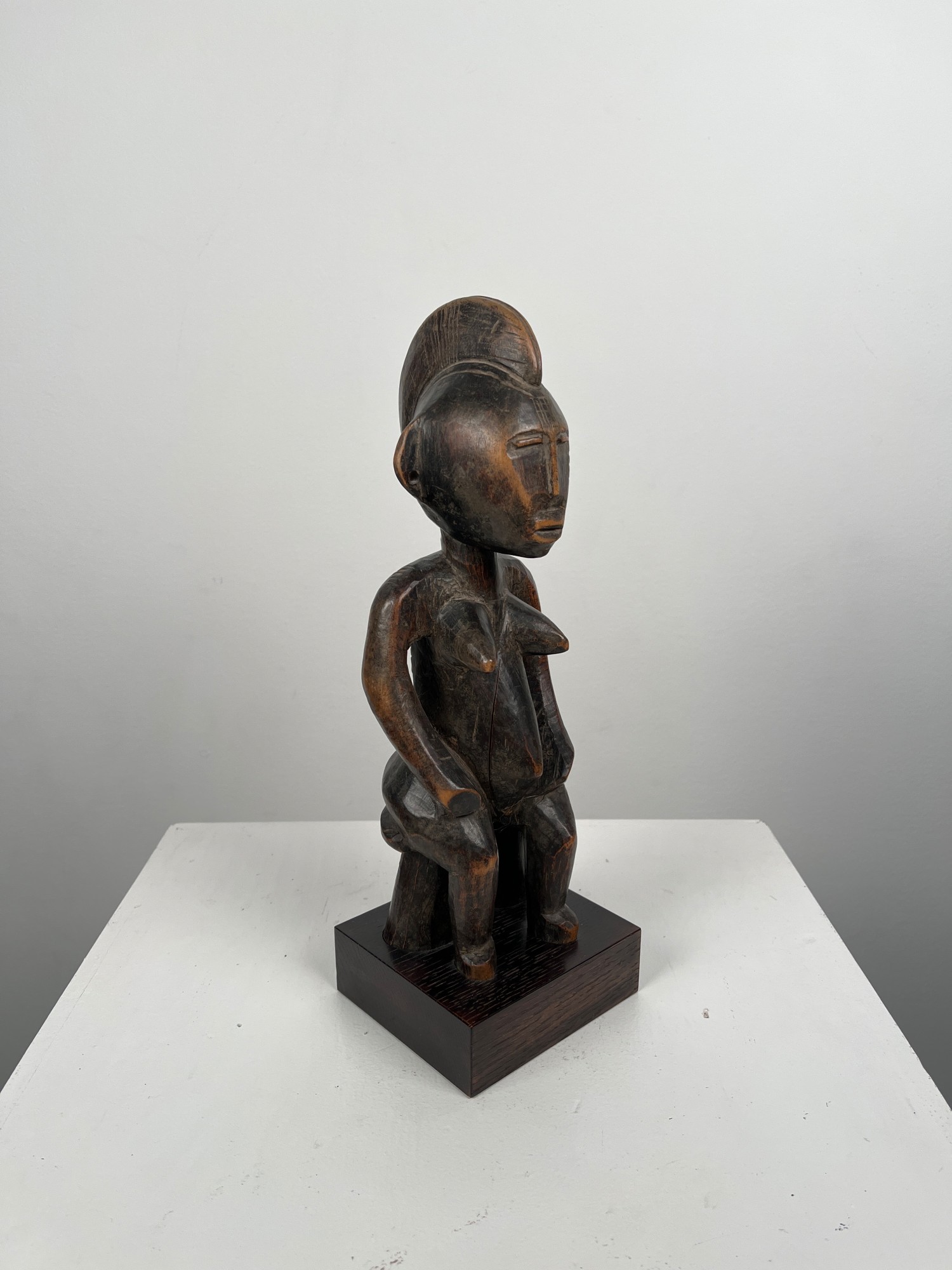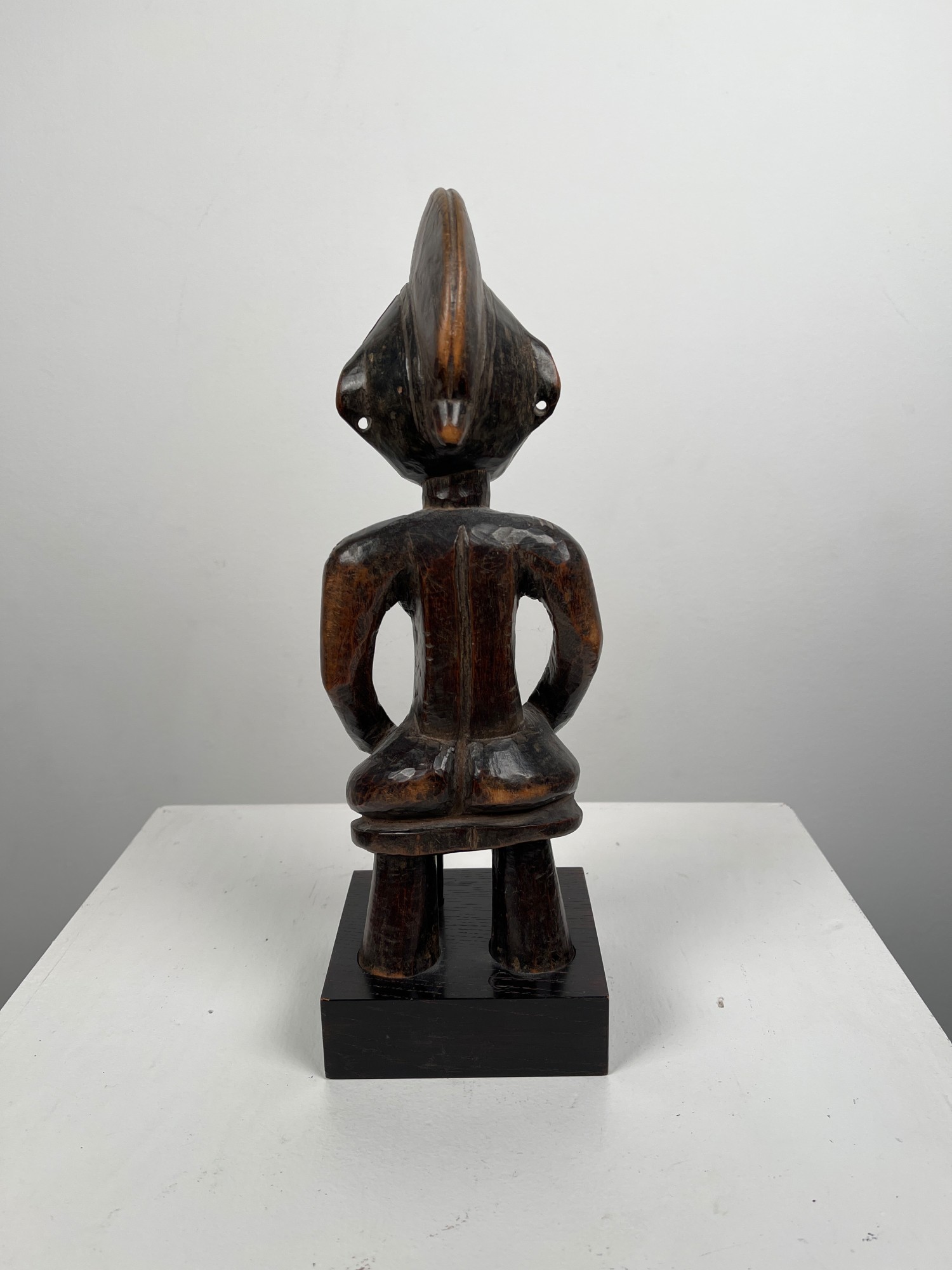 senufo wood seated female fiure. Inagaki wood stand. With stippled and scored incisions on the median crest, terminating in a pierced knob at nape of neck, small hatched panel on forehead, pierced ears, dark patina.