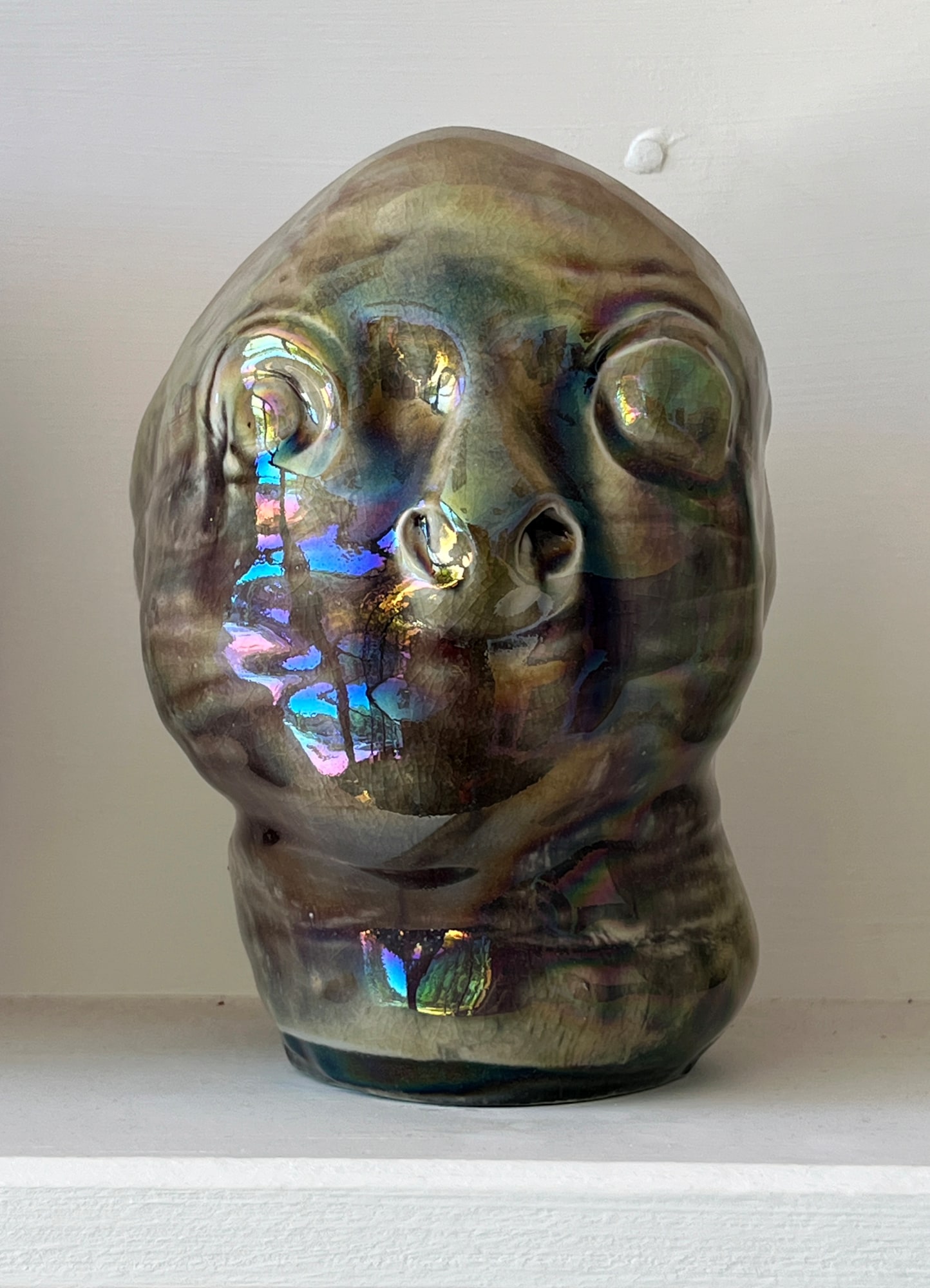 "The ceramic heads which came to be known as The Silent Witnesses were created by Mary between 1990 and the accident that ended her working life in 2015. She was long troubled by witnesses to unspeakable tragedy and inhumanity who bear their pain silently, unwilling or unable to speak out. The figures of this series share one common feature, the absence of a mouth with which to speak. At the time of Mary’s passing, she had brought into being several hundred of these figures, each one entirely different.