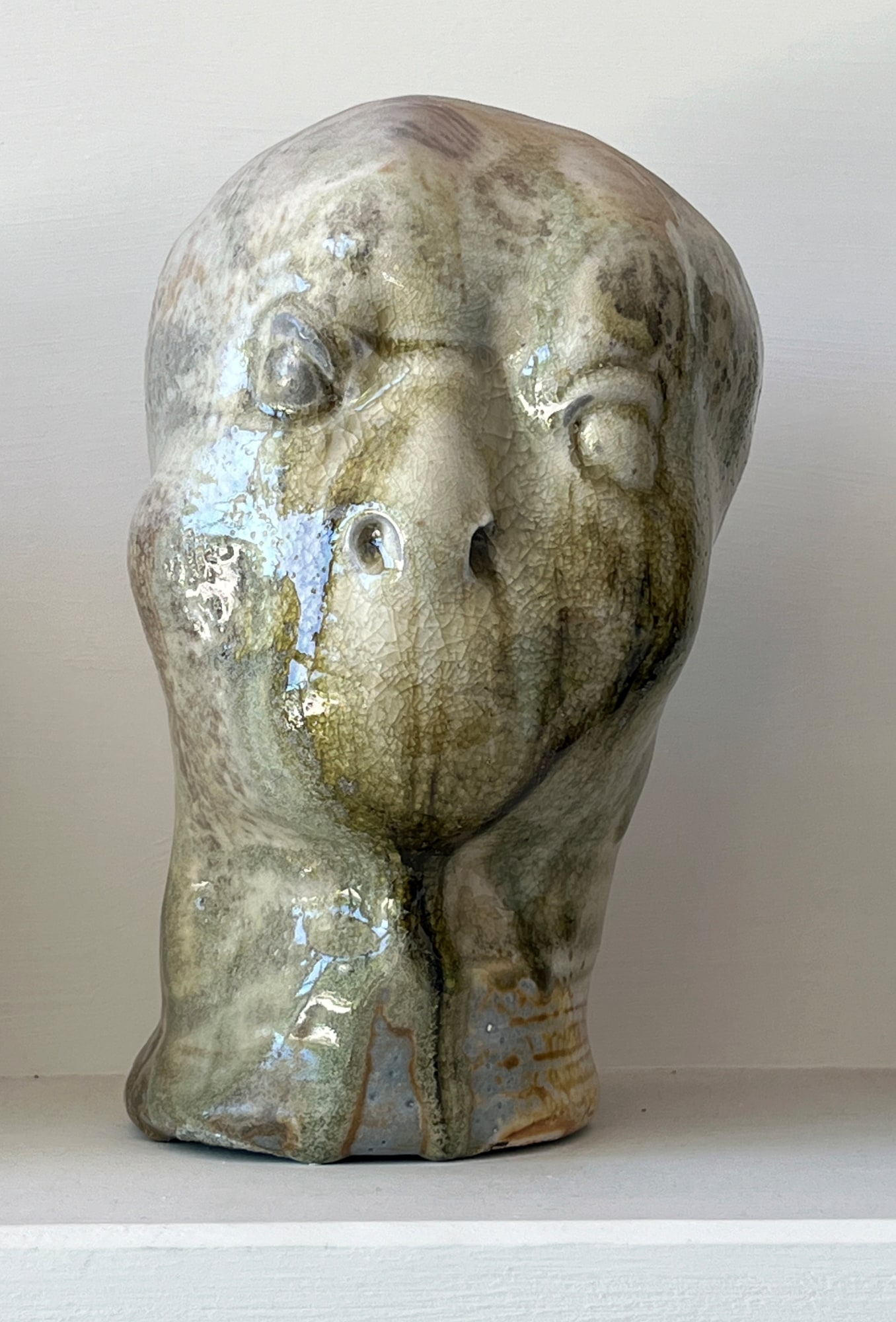 "The ceramic heads which came to be known as The Silent Witnesses were created by Mary between 1990 and the accident that ended her working life in 2015. She was long troubled by witnesses to unspeakable tragedy and inhumanity who bear their pain silently, unwilling or unable to speak out. The figures of this series share one common feature, the absence of a mouth with which to speak. At the time of Mary’s passing, she had brought into being several hundred of these figures, each one entirely different.