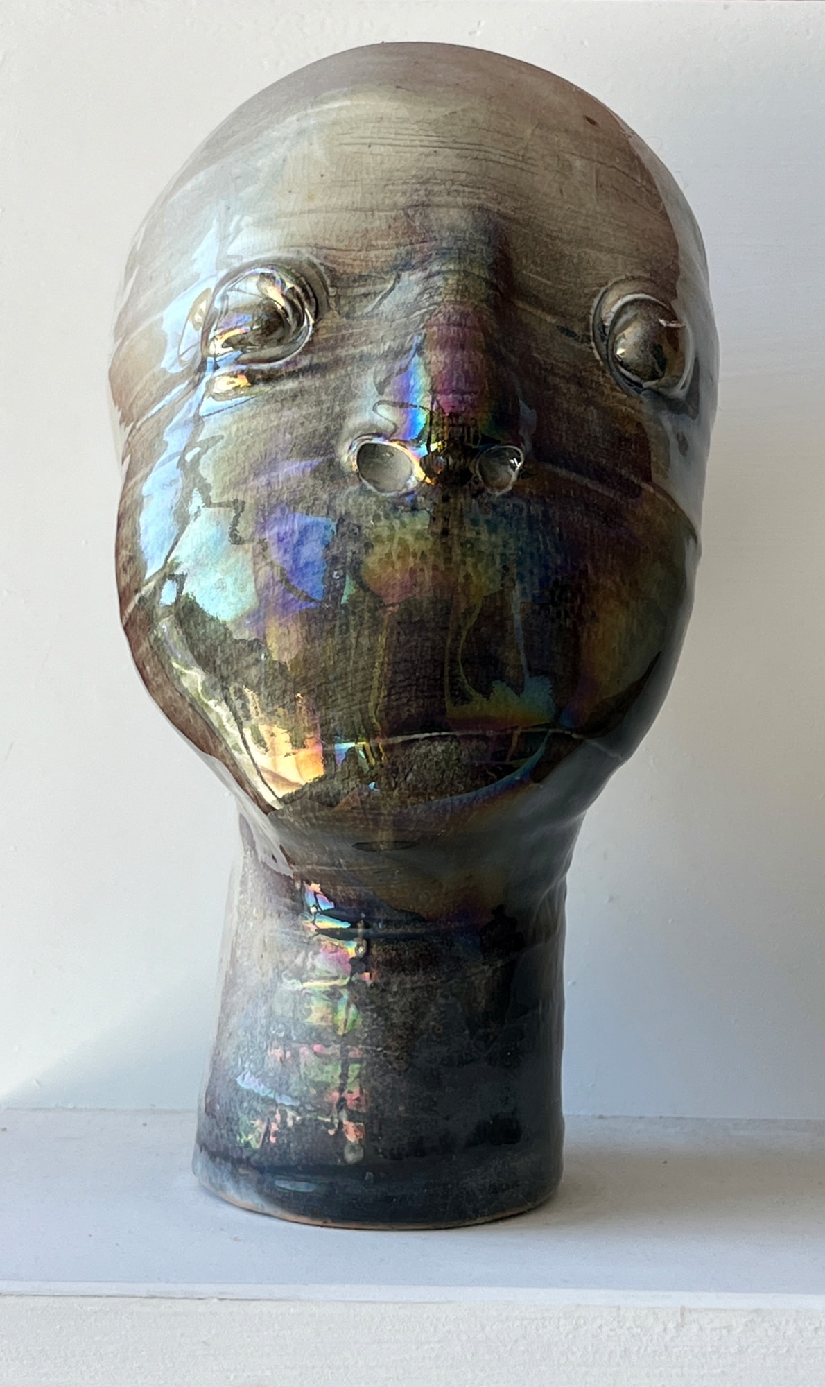 "The ceramic heads which came to be known as The Silent Witnesses were created by Mary between 1990 and the accident that ended her working life in 2015. She was long troubled by witnesses to unspeakable tragedy and inhumanity who bear their pain silently, unwilling or unable to speak out. The figures of this series share one common feature, the absence of a mouth with which to speak. At the time of Mary’s passing, she had brought into being several hundred of these figures, each one entirely different.
