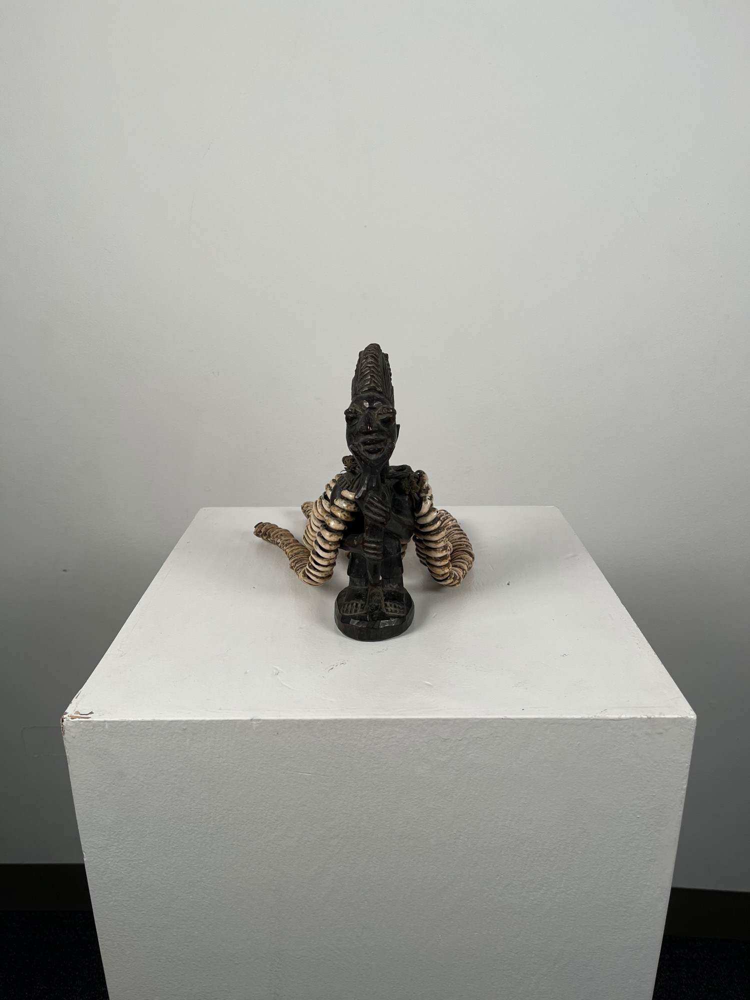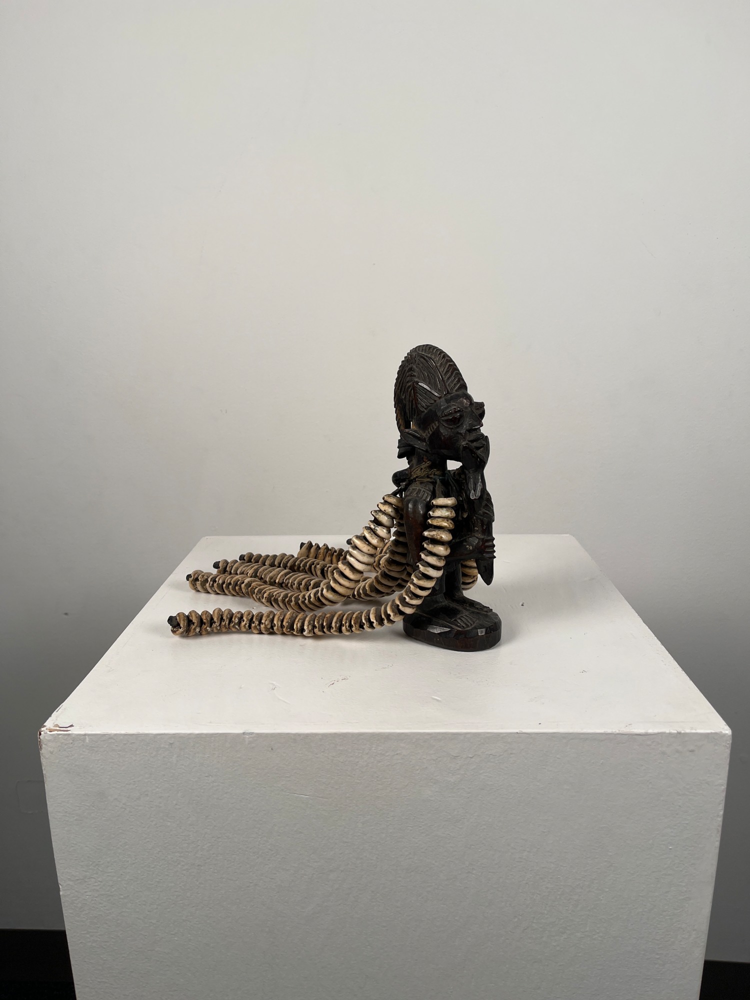 with scored lines with a pony tail hanging down around which is tied a leather strap. A leather strap around the neck holds six strands of cowrie shells forming a cape.