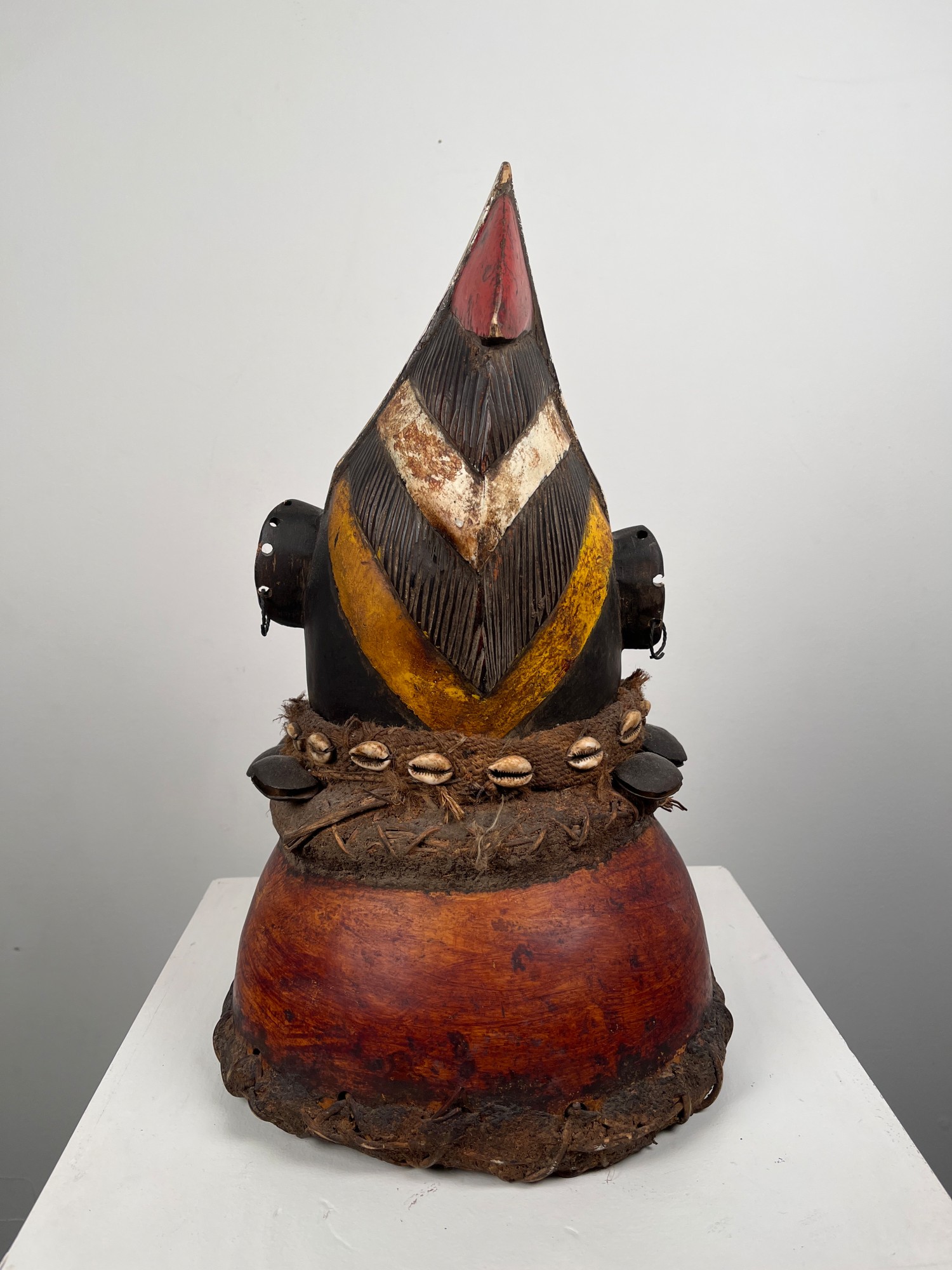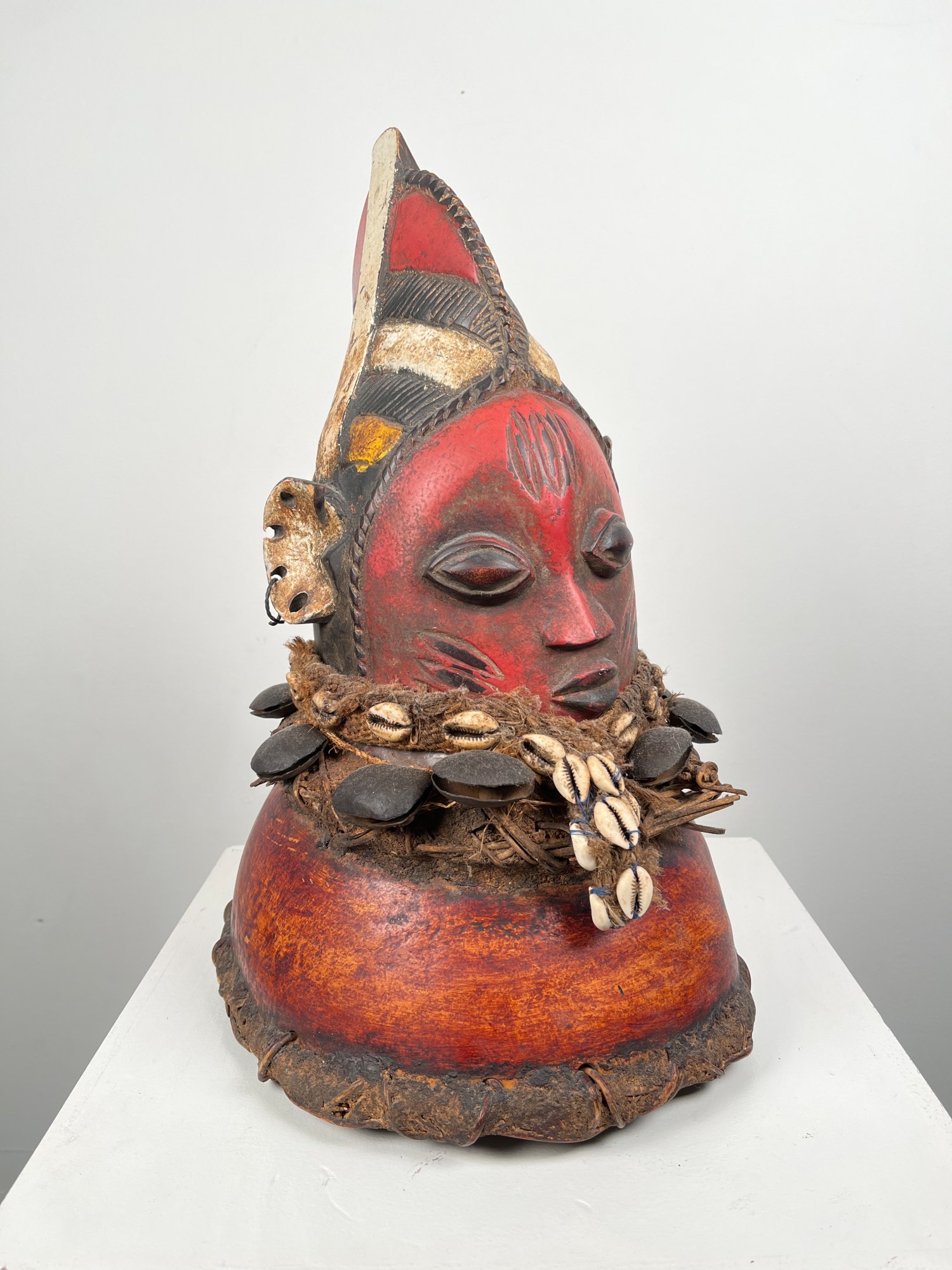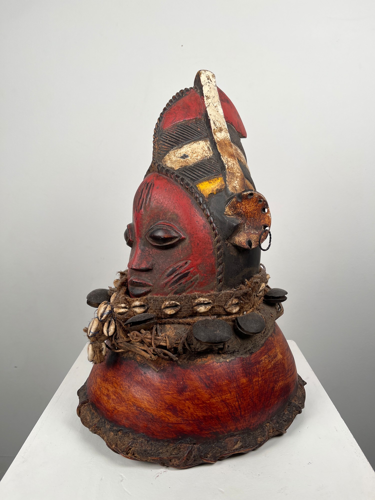 This mask is of typical Yoruba style and has traditional colors. The wooden mask itself is laced to a painted gourd. Around the juncture is a woven tie with cowrie shells attached and beneath this are bells. At the base of the gourd is another woven strip which is laced to it.