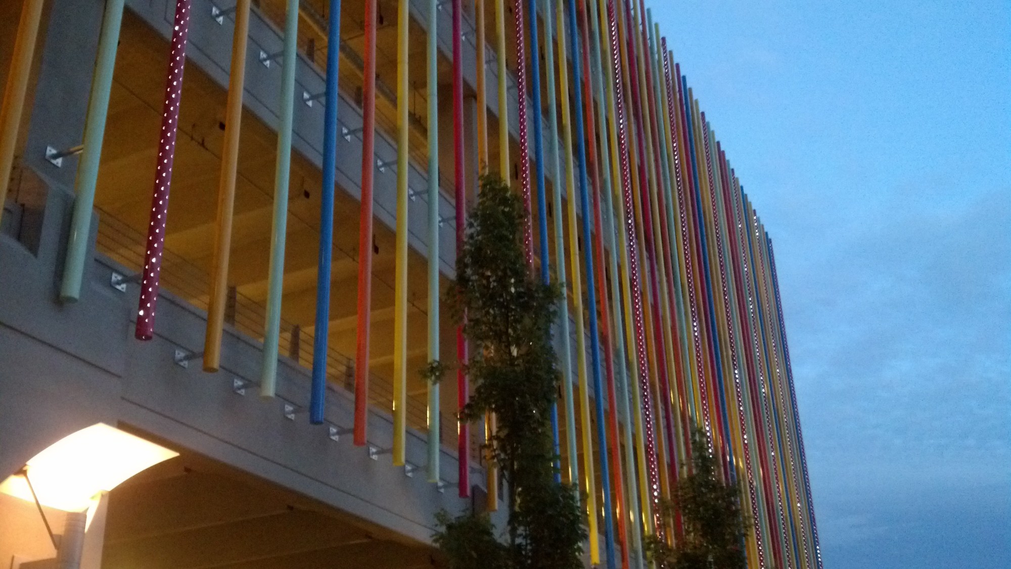 multi-colored powder coated aluminum tubes mounted on the facade of the Jefferson Avenue parking garage. Perforated tubes are lit from the inside at night.
