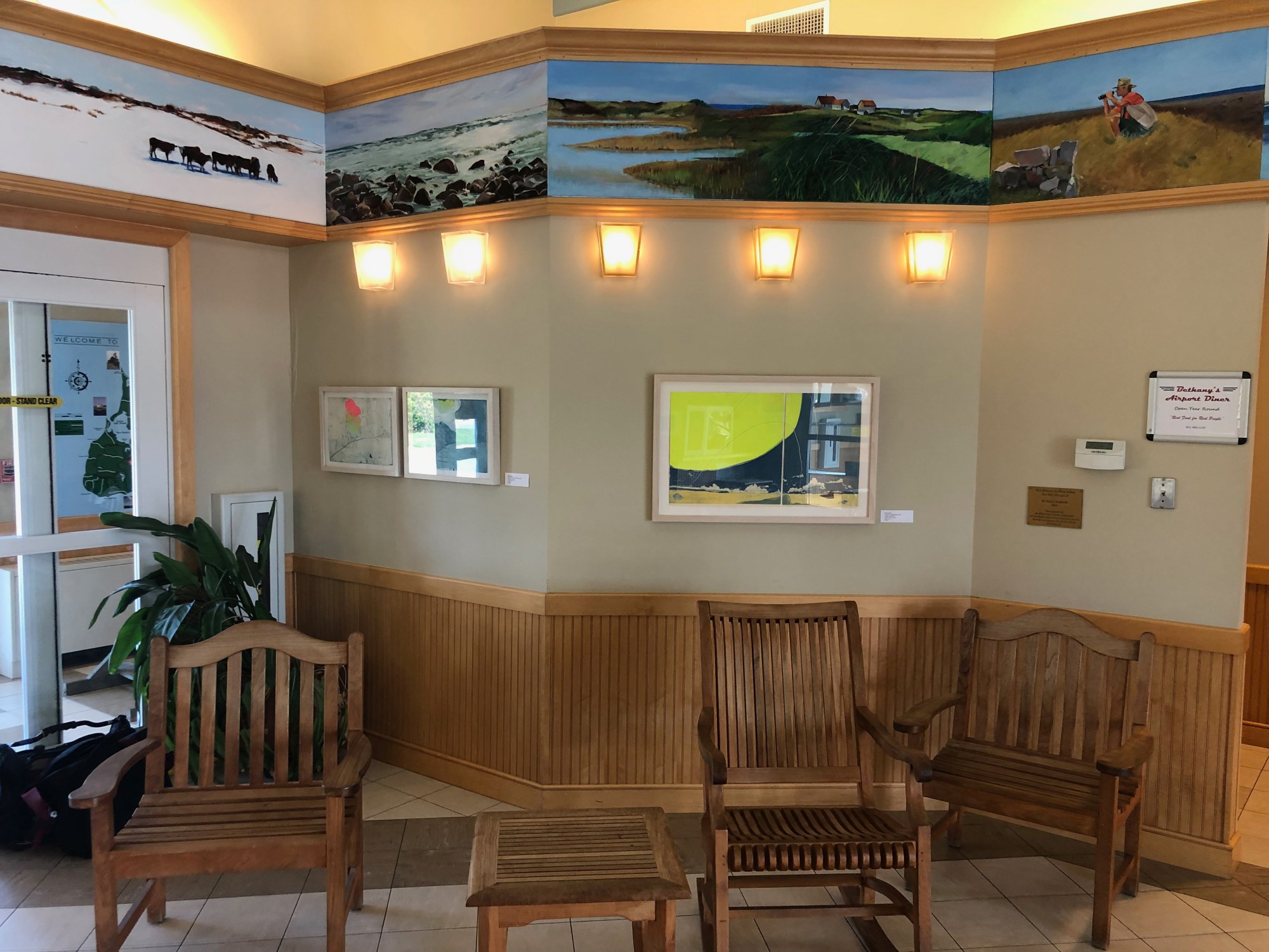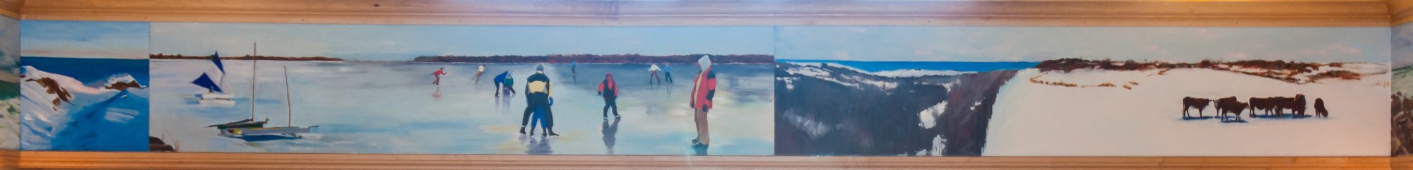 360 degree ceiling frieze consisting of oil paintings depicting the four seasons on Block Island. Mounted in ceiling above lobby of the Block Island Airport.