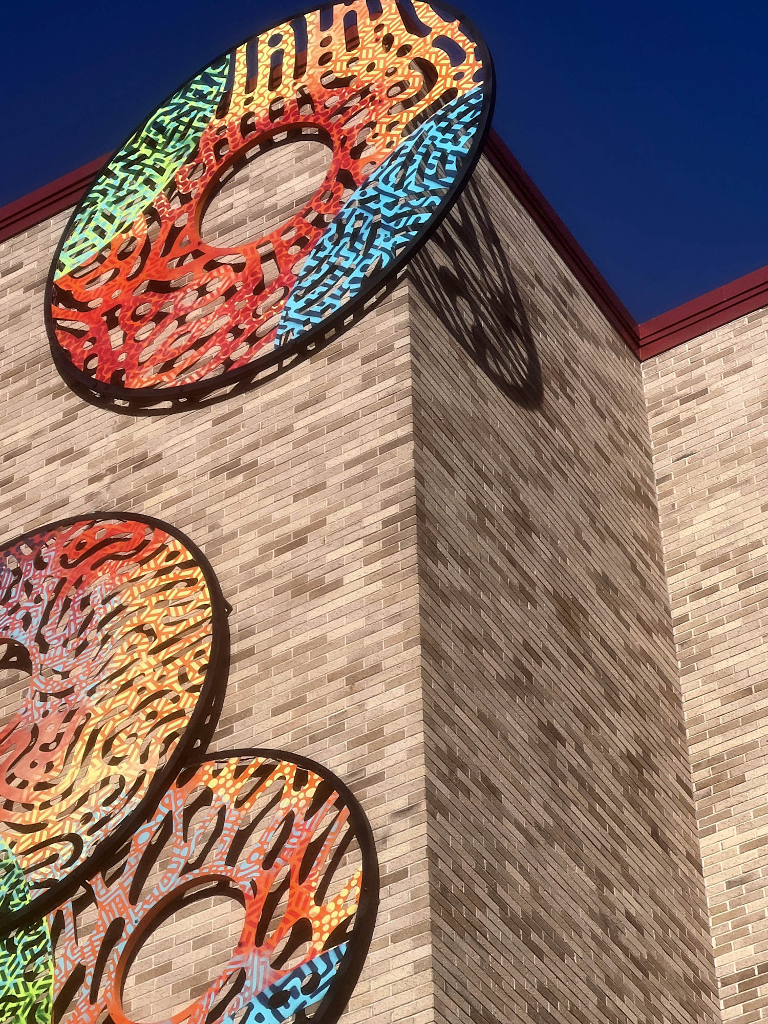 "Full Circle" by Ed Andrews celebrates the journey of becoming whole through the transformative power of education. Painted aluminum disks and illuminated at night through integrated LED lighting. Commissioned through the Allocation for Art for Public Facilities Act.
