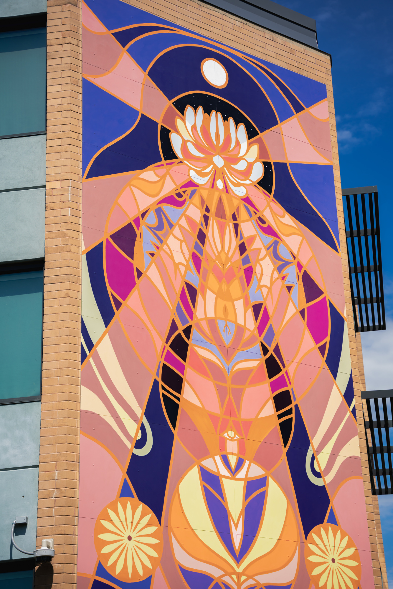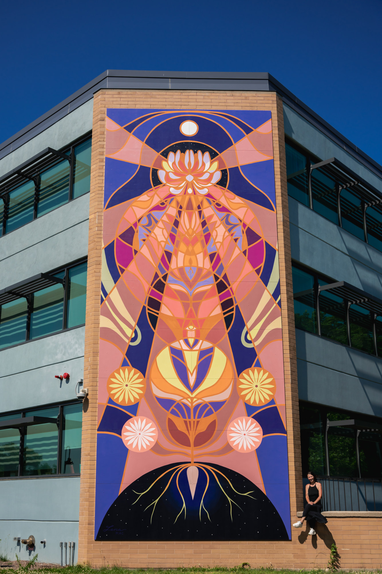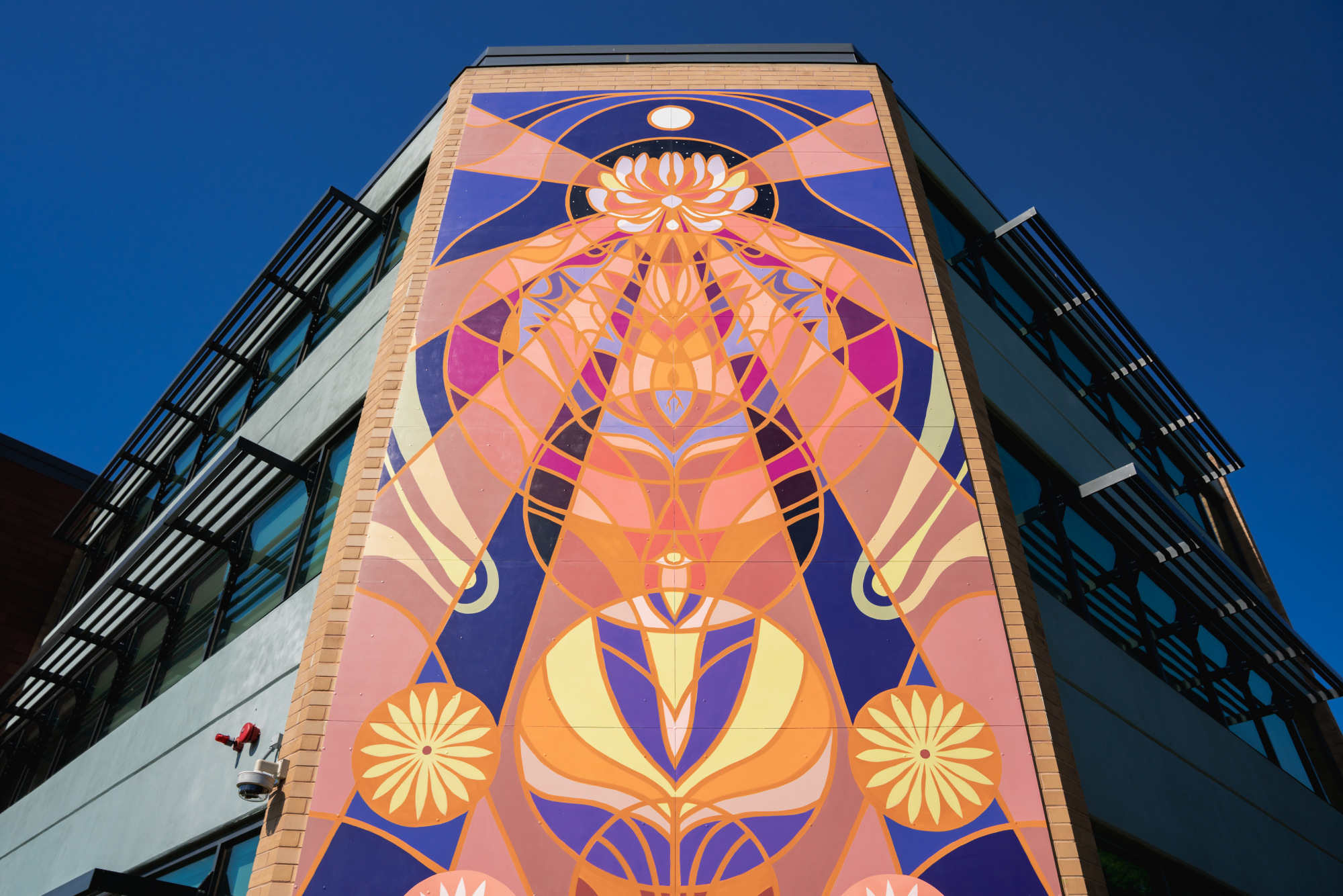 Commissioned by RISCA and Rhode Island College, Lena Mac's new mural "Germination" graces the new Horace Mann Hall. Themes of growth, knowledge, and empowerment support the Feinstein College of Education and Human Development's mission.
