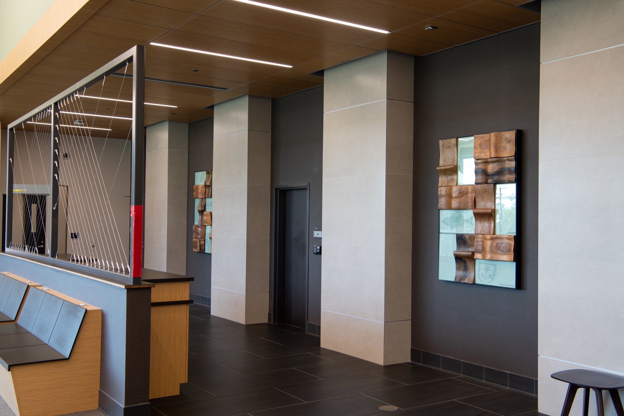 Commissioned by Rhode Island State Council on the Arts, for the AG’s Office in Providence, The Size of Rhode Island features outdoor and indoor sculptures. Visitors initially approach seven entryway columns. Glass maps 400 miles of the Ocean State’s Atlantic coastline. In the lobby, visitors are greeted by two panels. Carved wood depicts three types of breaking waves, to parallel each individual’s dive into the waves of justice. Per Nobel Prize poet and Irishman Seamus Heaney, “The longed-for tidal wave / Of justice can rise up / And hope and history rhyme.” My series nods to the past and looks to the future.