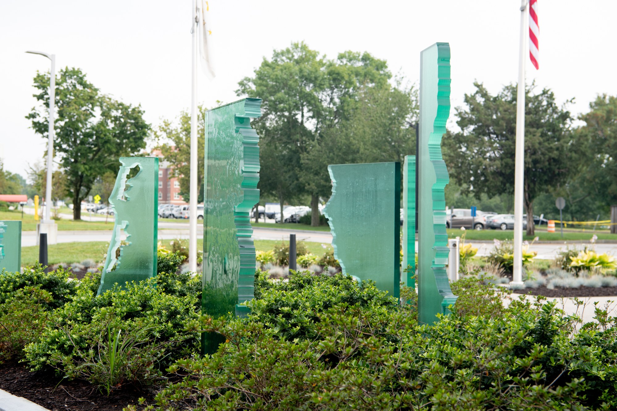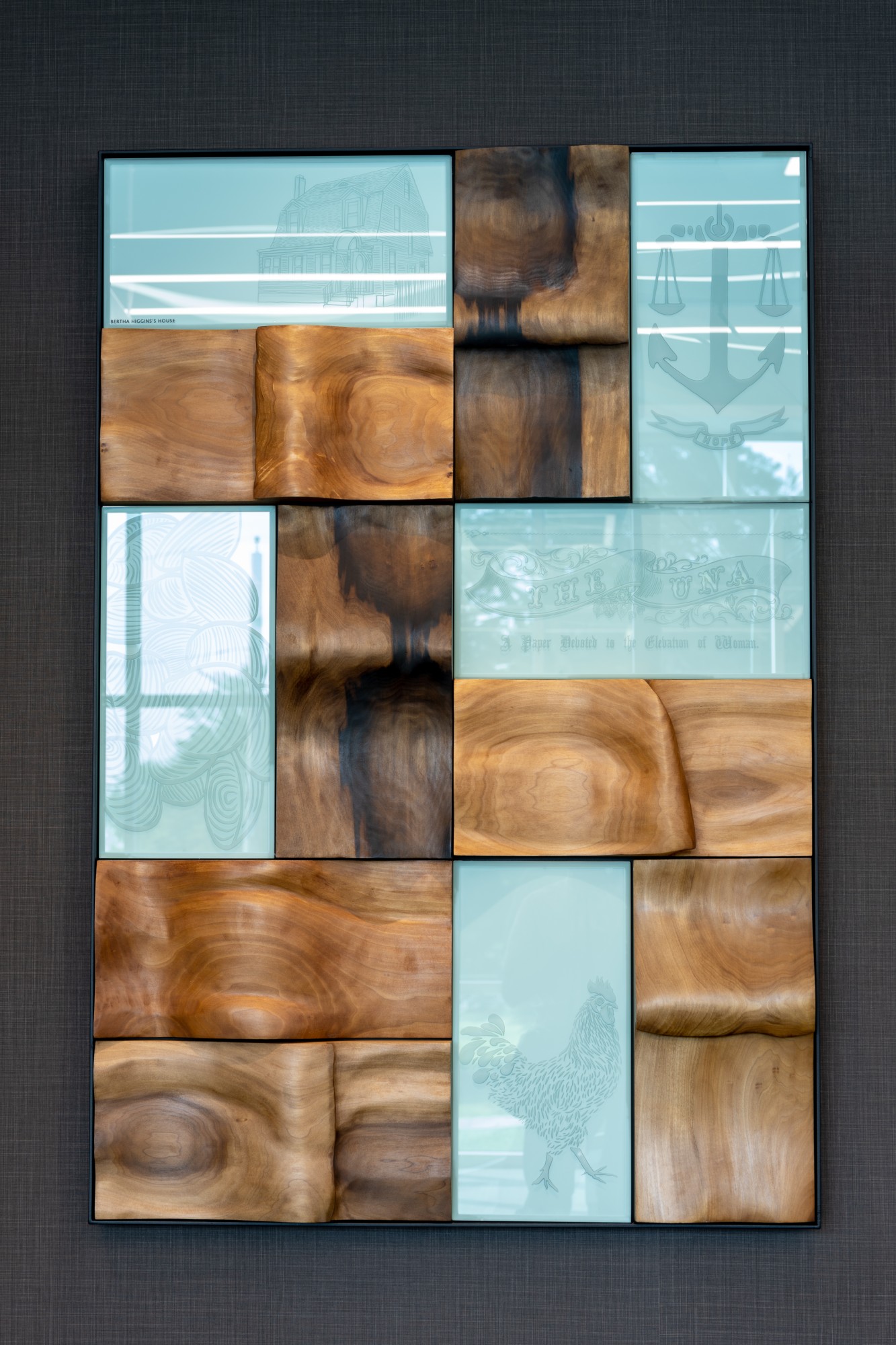 Commissioned by Rhode Island State Council on the Arts, for the AG’s Office in Providence, The Size of Rhode Island features outdoor and indoor sculptures. Visitors initially approach seven entryway columns. Glass maps 400 miles of the Ocean State’s Atlantic coastline. In the lobby, visitors are greeted by two panels. Carved wood depicts three types of breaking waves, to parallel each individual’s dive into the waves of justice. Per Nobel Prize poet and Irishman Seamus Heaney, “The longed-for tidal wave / Of justice can rise up / And hope and history rhyme.” My series nods to the past and looks to the future.