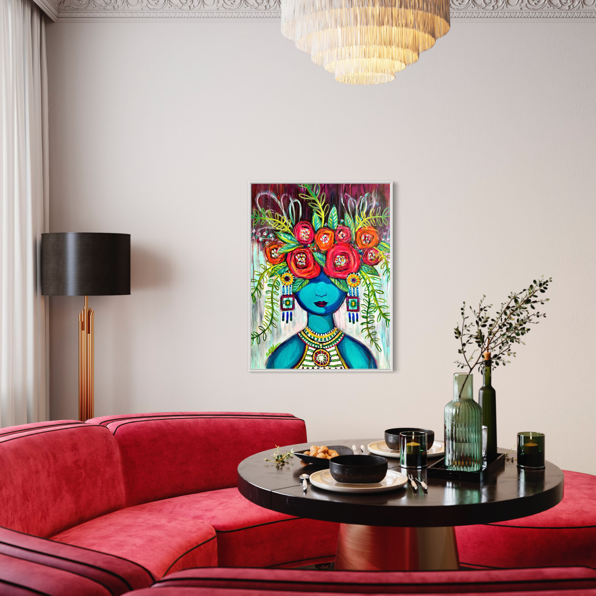 Dive into the enchanting world of "Azure Muse," where beauty meets emotion in every stroke. Behold this captivating artwork featuring the blue-faced women series, a symbol of strength, mystery, and grace. This piece is a tribute to the multifaceted essence of womanhood, a reminder of the ever-present beauty that can be discovered within.