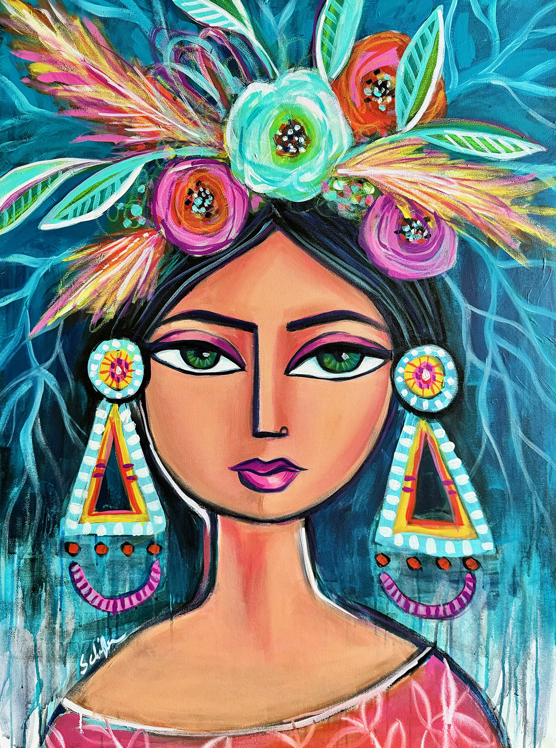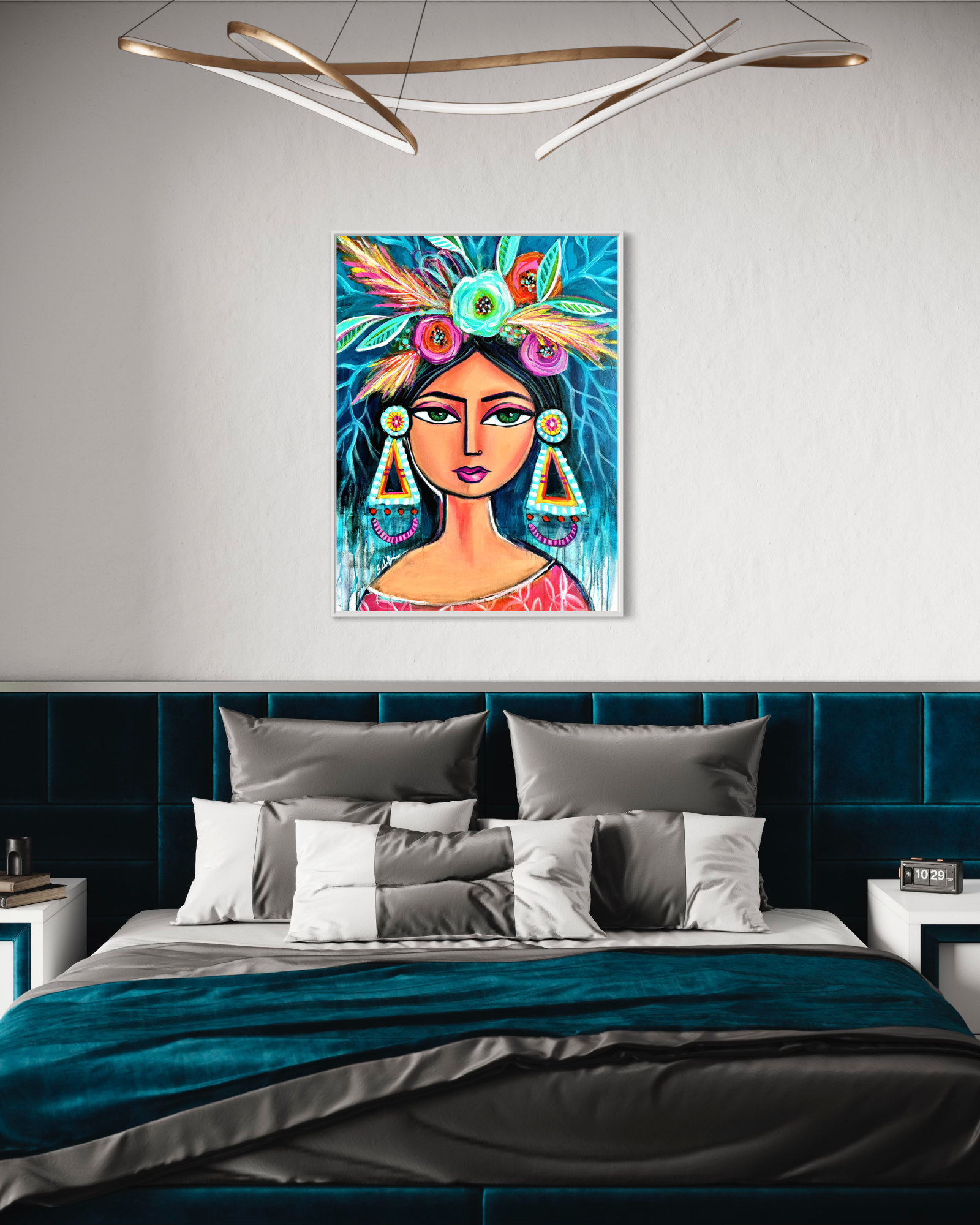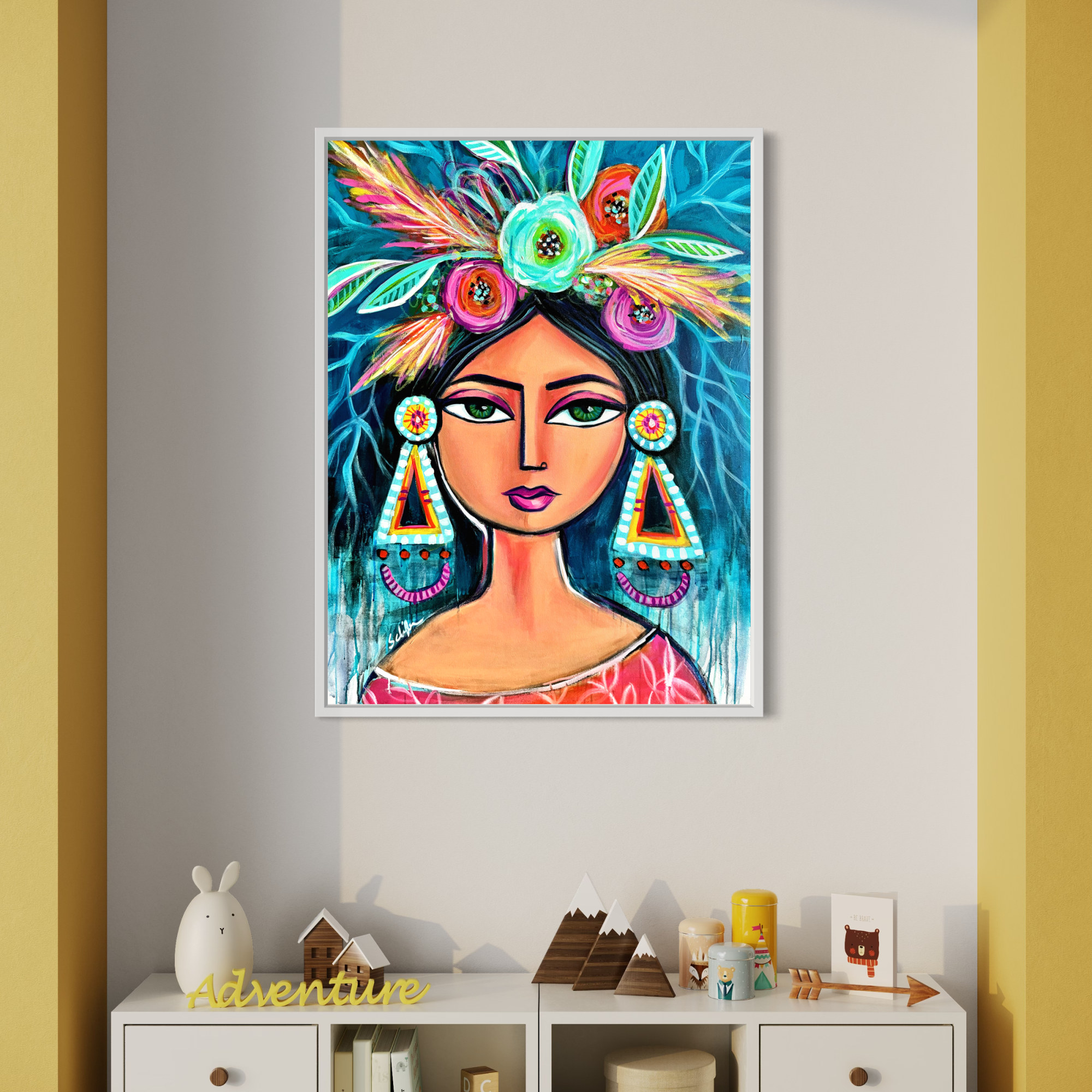 Witness the harmonious fusion of feminine grace and botanical splendor. In the creation of "Floral Majesty," I sought to encapsulate the timeless connection between femininity and the delicate beauty found in nature. The painting portrays a woman adorned with an intricately woven crown of flowers, each petal a brushstroke in the narrative of her grace.