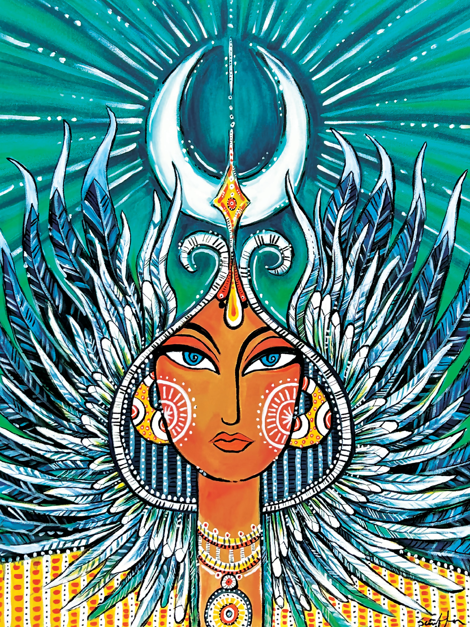 "In my painting, 'Lunar Flight,' I embark on a journey through the ethereal realms of the night sky, where the moon casts its enchanting glow upon the world below. At the heart of the composition stands a woman, surrounded by a halo of feathers, she embodies the spirit of flight and transcendence, her presence evoking a sense of grace and serenity.