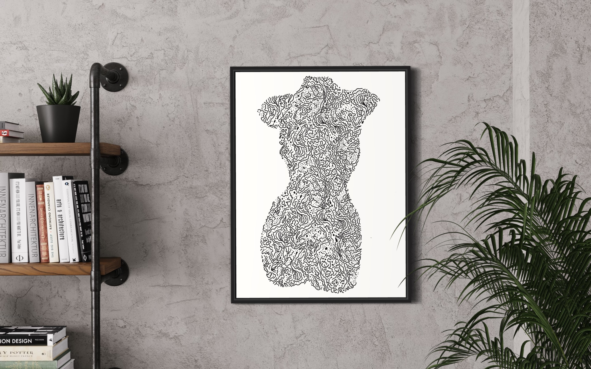 Squiggly Torso by Rising Moon Studio  Image: Original drawing by Taylor Schiffer-Jander. Acrylic pen on Legion Stonehenge white 250gsm paper, mounted to cradle board, sealed, varnished then framed. Artwork is signed and ready to hang.