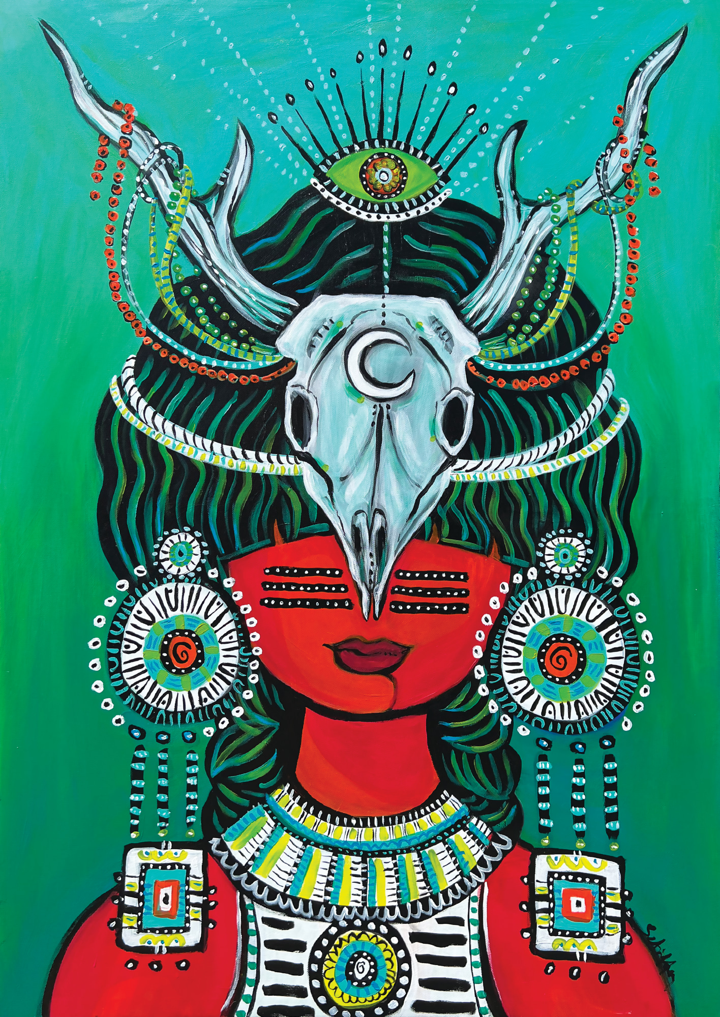 At the heart of the composition stands the pagan priestess, a conduit between the earthly realm and the divine. Her presence is shrouded in mystery, her identity concealed behind the visage of a skull mask. This mask, a symbol of mortality and rebirth, serves as a reminder of the inherent duality of existence – the eternal dance between life and death, creation and destruction.