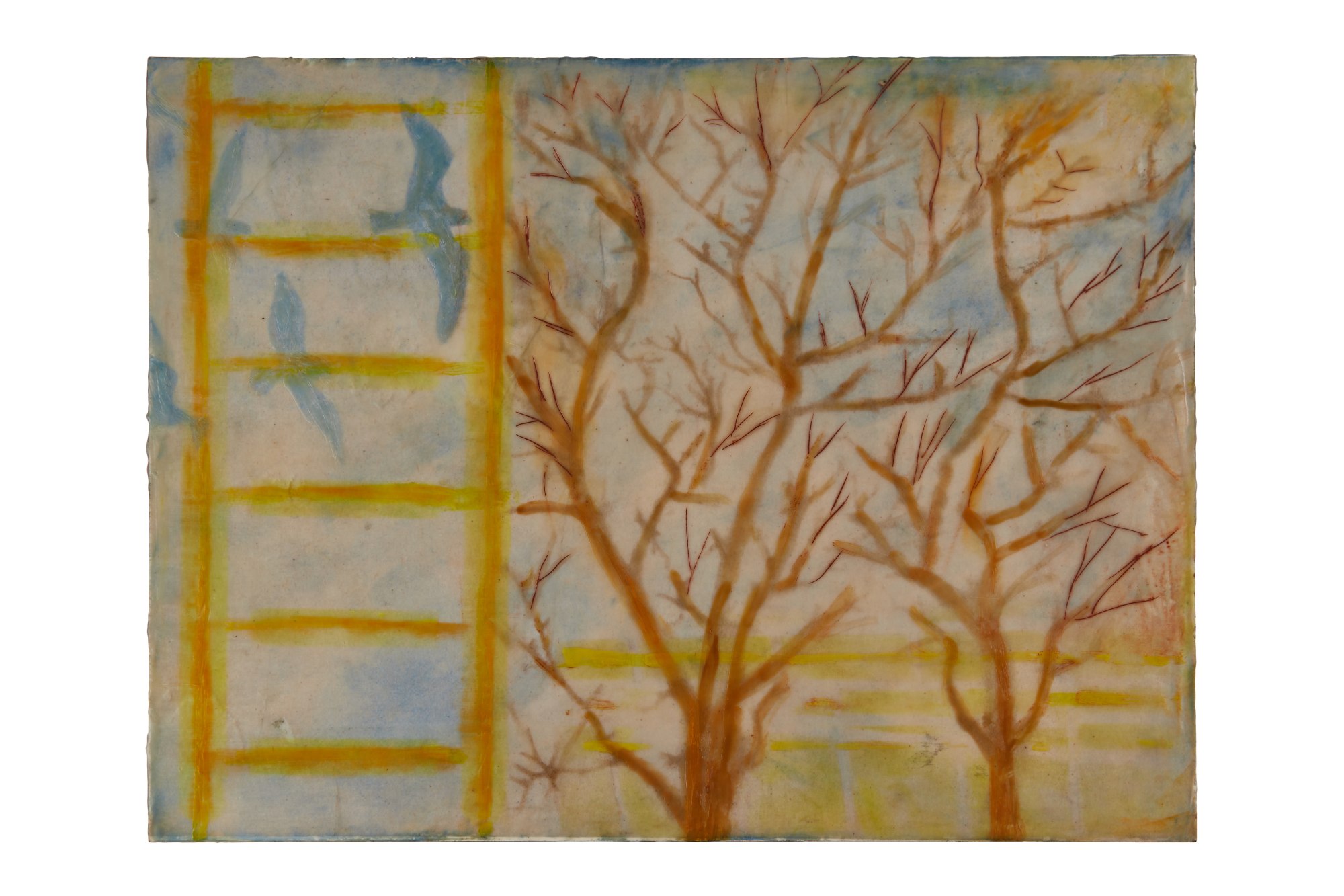 In this captivating encaustic painting, Rita Adams weaves a tapestry of hope and transformation. As winter's chill begins to thaw, the trees stand poised to burst forth with new life, symbolizing the promise of a brighter future. A majestic ladder, sent from above, stretches towards the earth, bridging the divine and the human. Meanwhile, a flock of birds gathers, waiting patiently for Jacob to continue on his journey to Aram, a path that will shape his destiny. With its rich textures and vibrant colors, "Dreams of Destiny" invites the viewer to step into the threshold of possibility, where the boundaries between heaven and earth dissolve, and the dreams of tomorrow unfold.