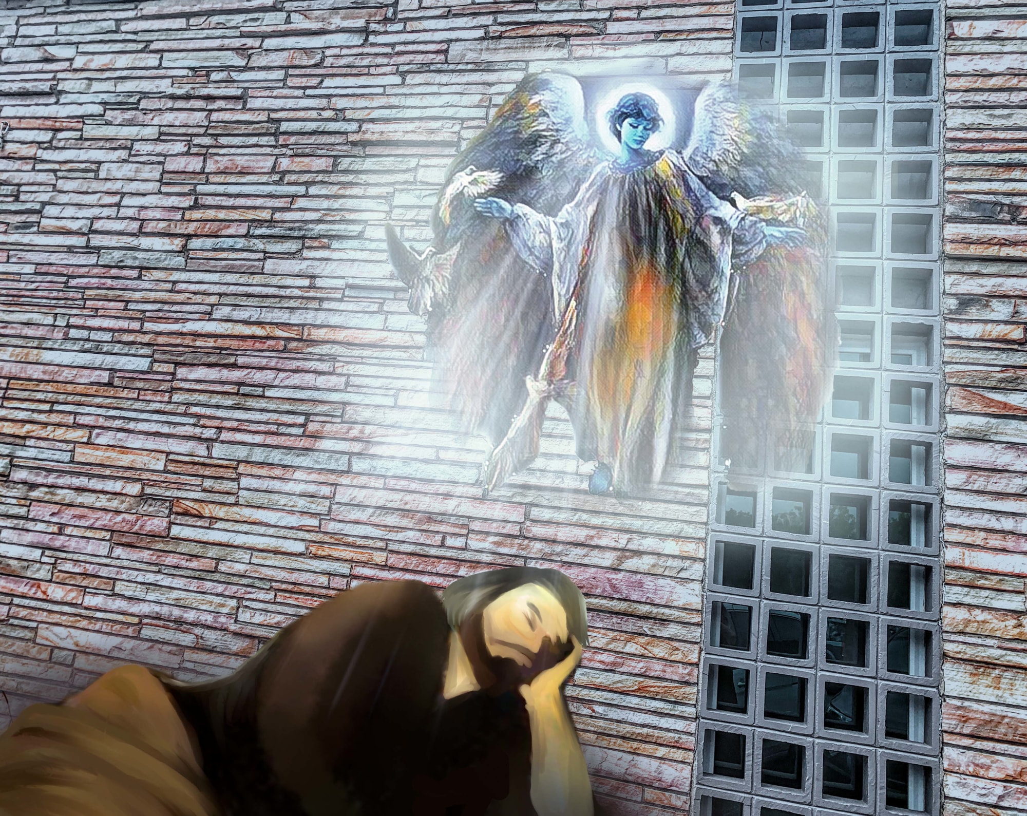 In this captivating artwork, Rita Adams reimagines the biblical narrative of Jacob's Ladder (Genesis 28:10-22). Set against the weathered wall of Hope Chapel in Austin, Texas, the artwork depicts an angel and Jacob sleeping, blending the spiritual with the architecture to create a contemplative scene of divine connection and hope.