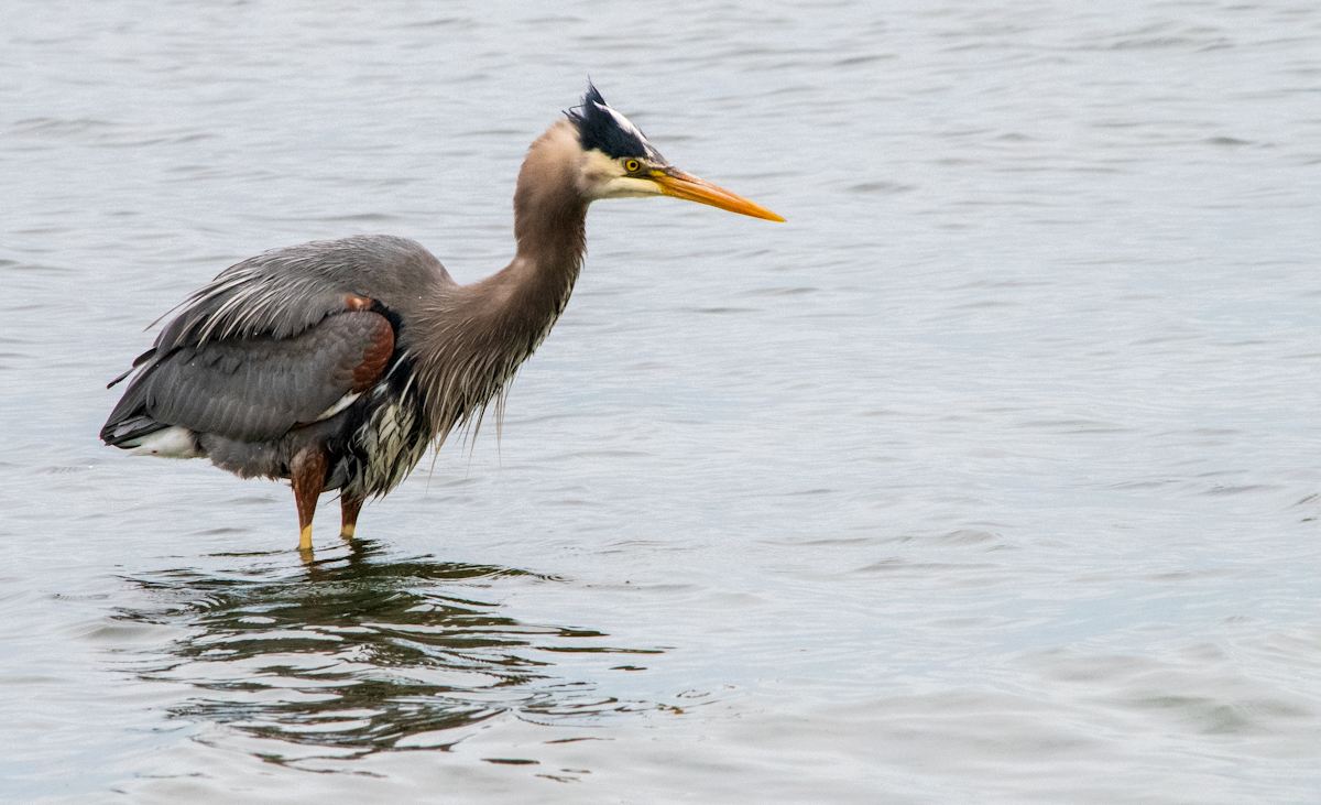 A great blue heron fishes in the shallow waves of the Salish sea.