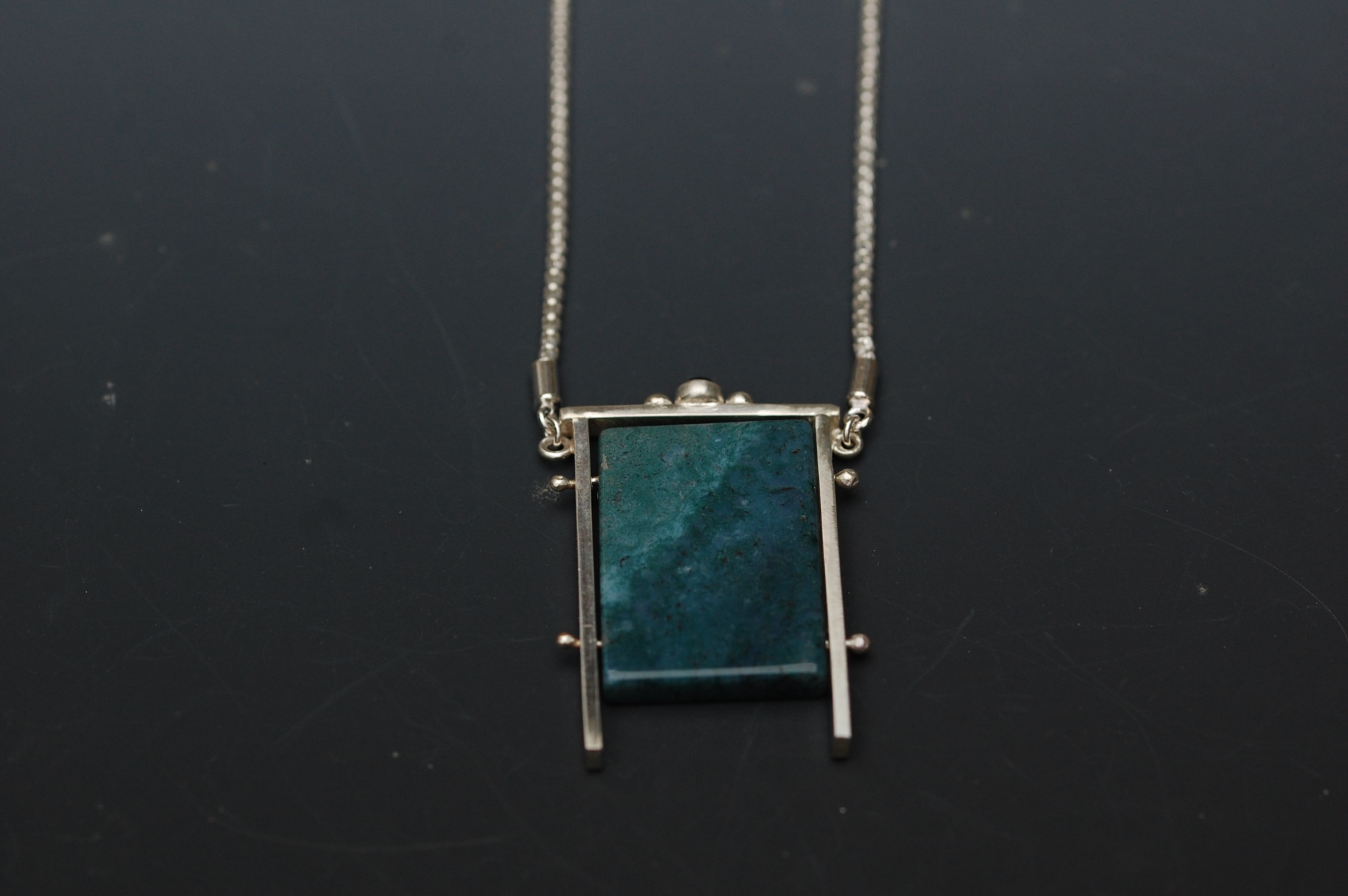 Bluegreen Stone w/Black Onyx by Susan Baez  Image: 1" x .75" x 18" chain