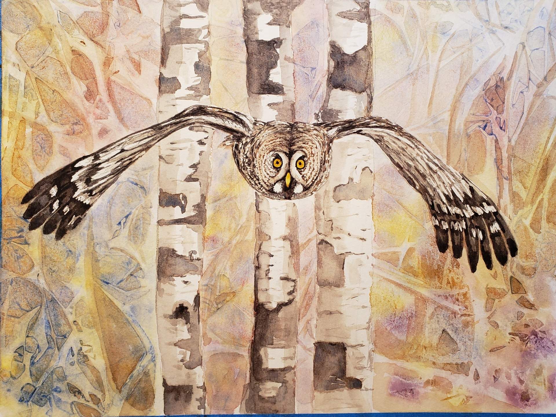 "Closing In" is a watercolor on 300lb paper, in Windsor & Newton Professional watercolors. It depicts an owl flying through a grove of paper birch, zeroing in on his dinner.
