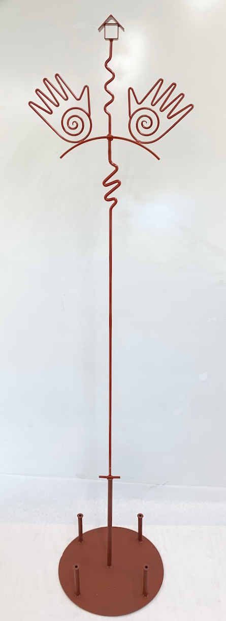 • Subject Matter: Red garden sculpture with two hands and spiral design