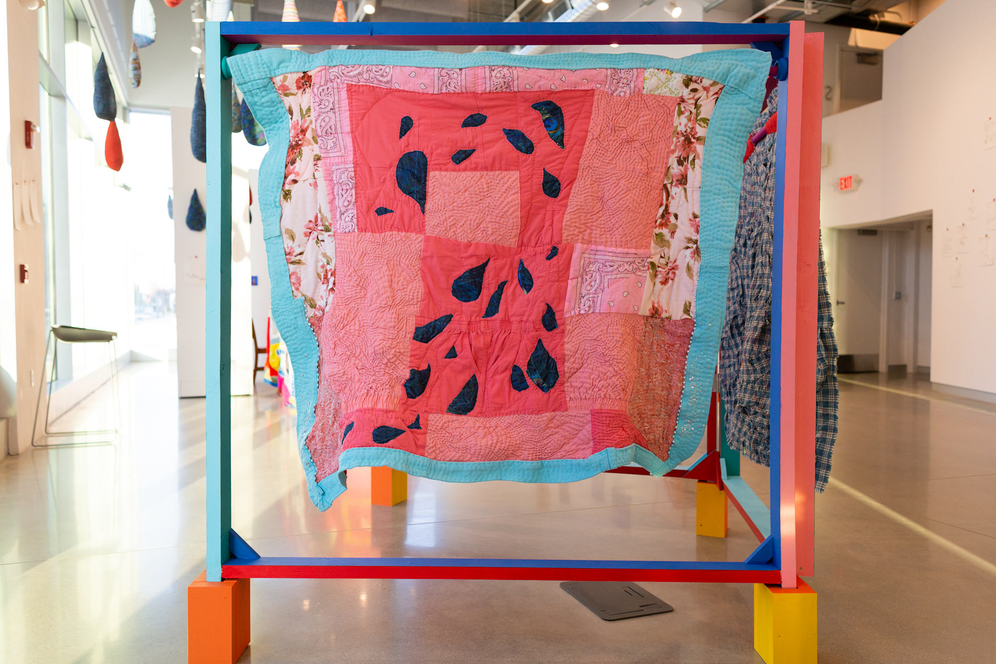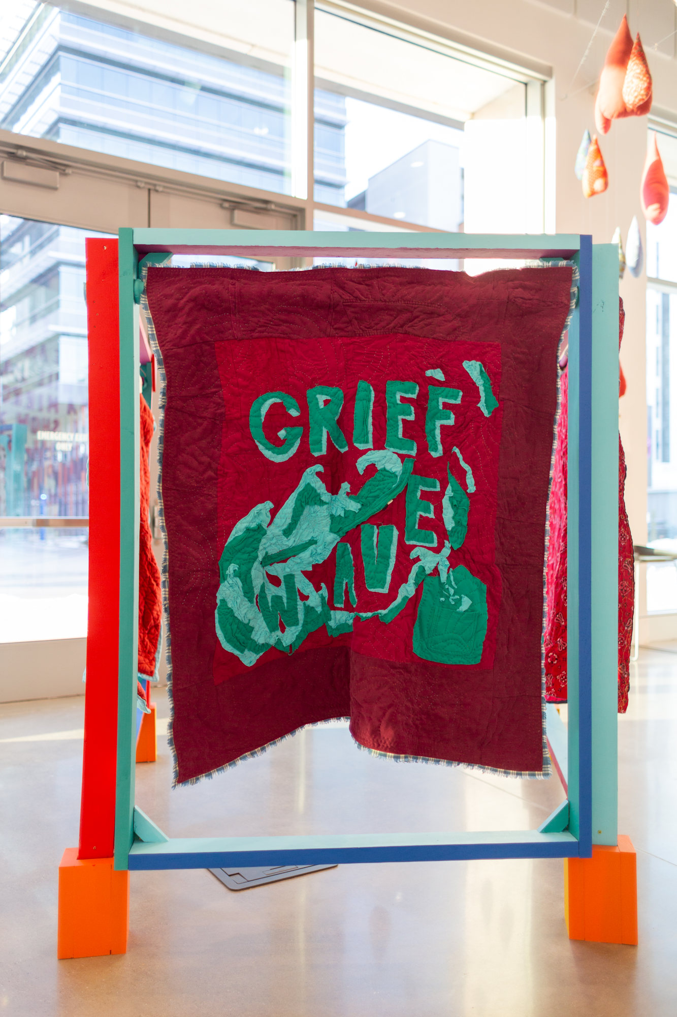 Grief Wave Quilt #1 -#3 by Jennifer Bastian  Image: #1: Not For Sale: Cotton and polyester skirts and pants, cotton tablecloth, scrap fabric, thread 40 x 46”