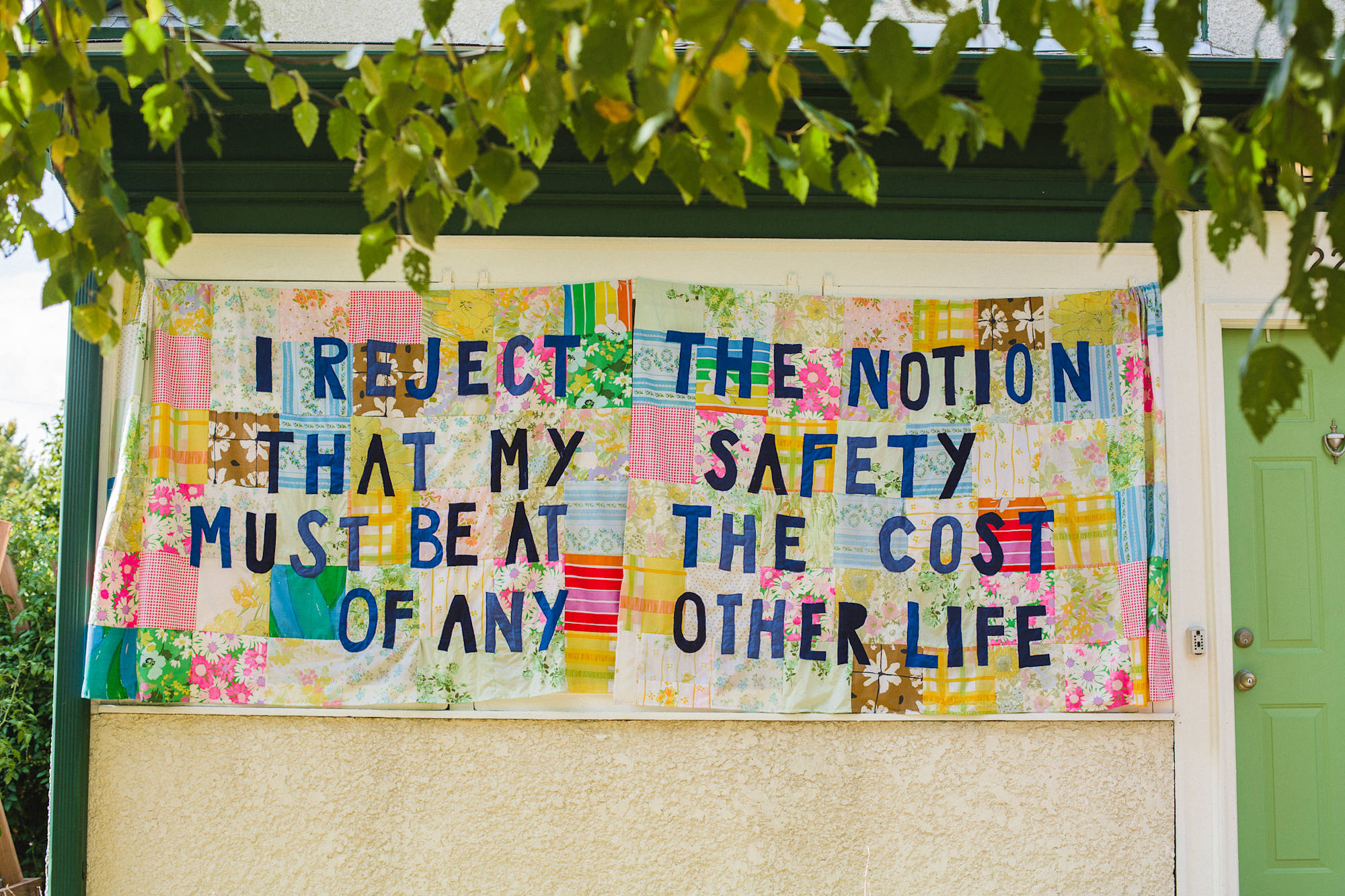 This piece is a patchworked banner that hung on a house across the street from an elementary school in the Northeast neighborhood of Minneapolis from October, 2024 to April, 2025. It is a response to the various genocides occuring around the globe funded by and/or supported by the United States. My hope with public banner works is always to invite curiosity and conversation, as well as to inspire viewers to feel solidarity in the knowledge that if the message resonates with them, they are not alone.