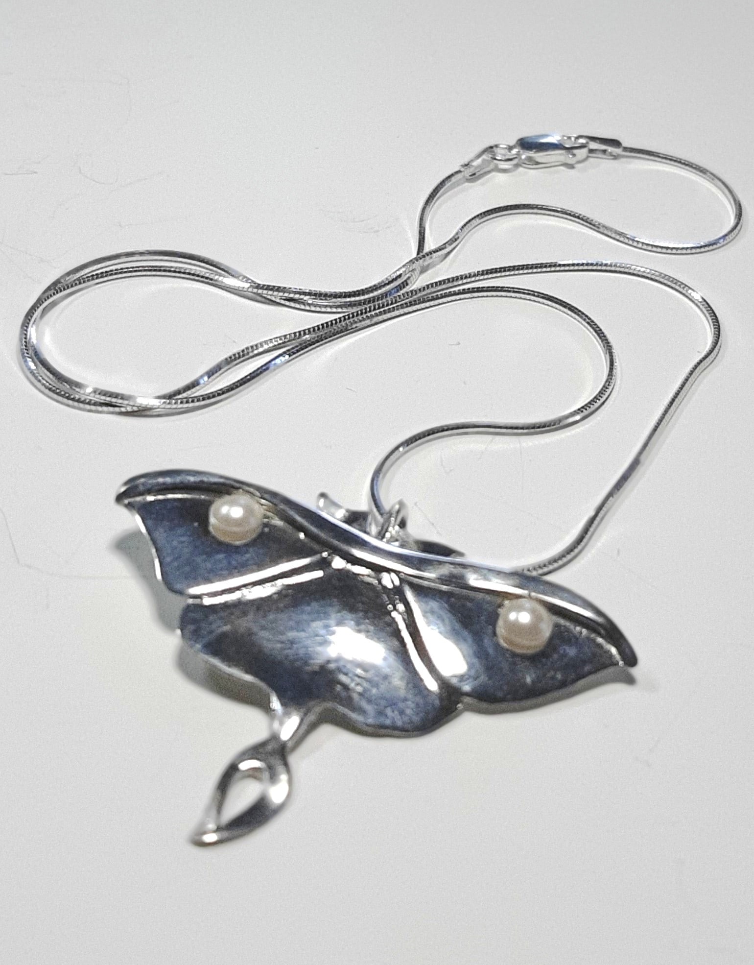 Shape of a luna moth designed to hang high near the throat. Dimensions: 1" X 1 1/2", 18" chain.