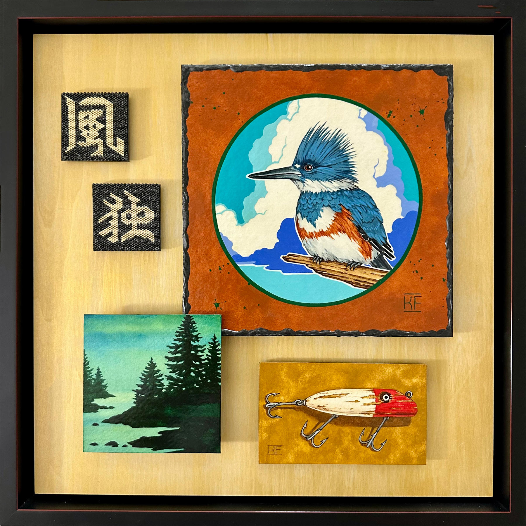 For artists, there’s not much that’s more evocative of “Wings & Water” than time spent on our lakes and rivers, surrounded by the gentle sound of lapping waves, the rustle of leaves, the scent of pine trees and the call of shorebirds. There’s something elemental about the solitude, the tranquil setting, the pure connection with nature. This mixed media work combines gouache paintings with off-loom beadwork. The paintings by Kenneth Ferguson are gouache on panel, archivally varnished. The Japanese Kanji symbols, designed and stitched by Diana Ferguson using glass cylinder beads and monofilament thread, represent nature and solitude.