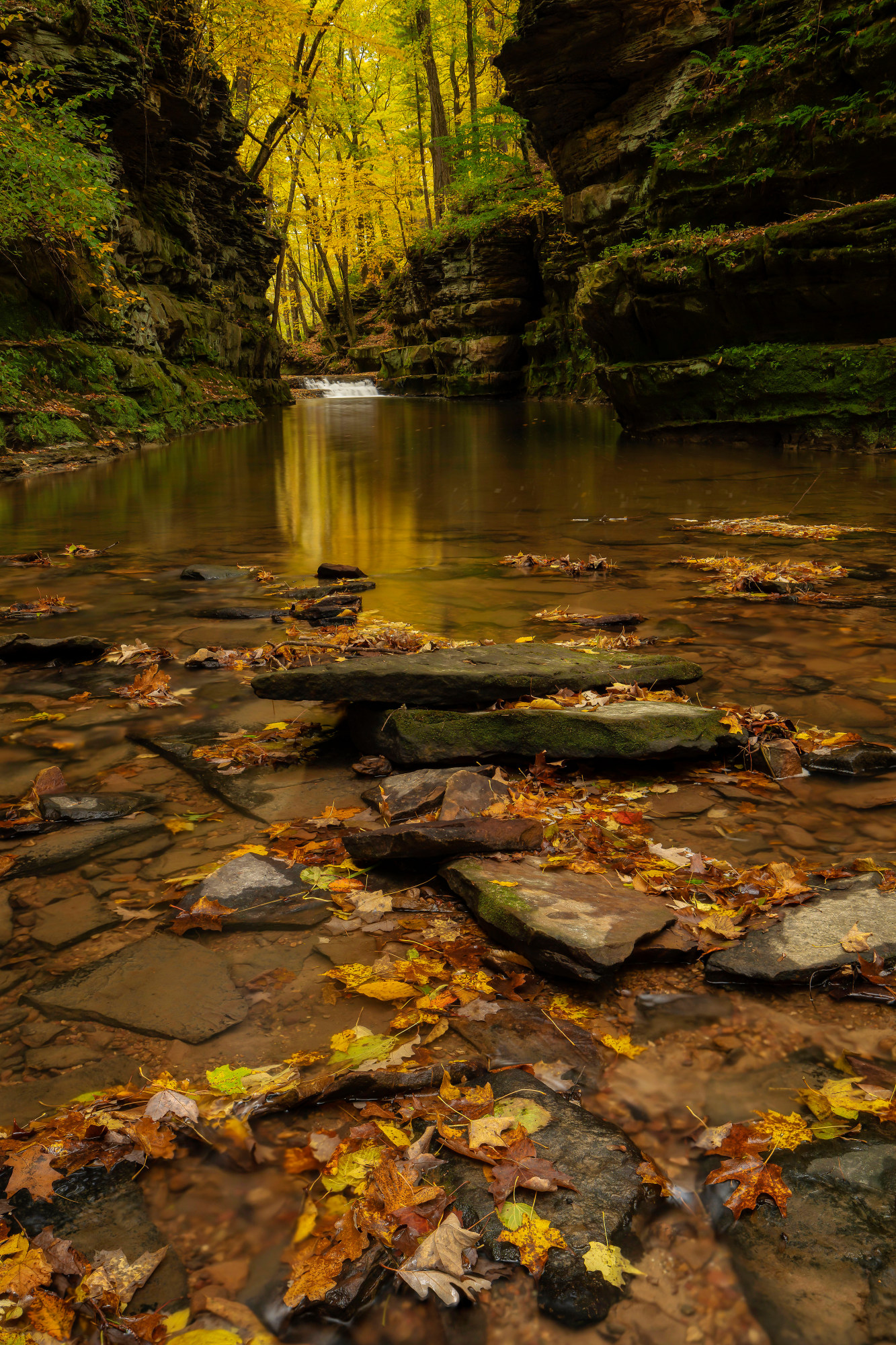 - Subject Matter: Stones and fall leaves at the bottom of a gorge in a stream