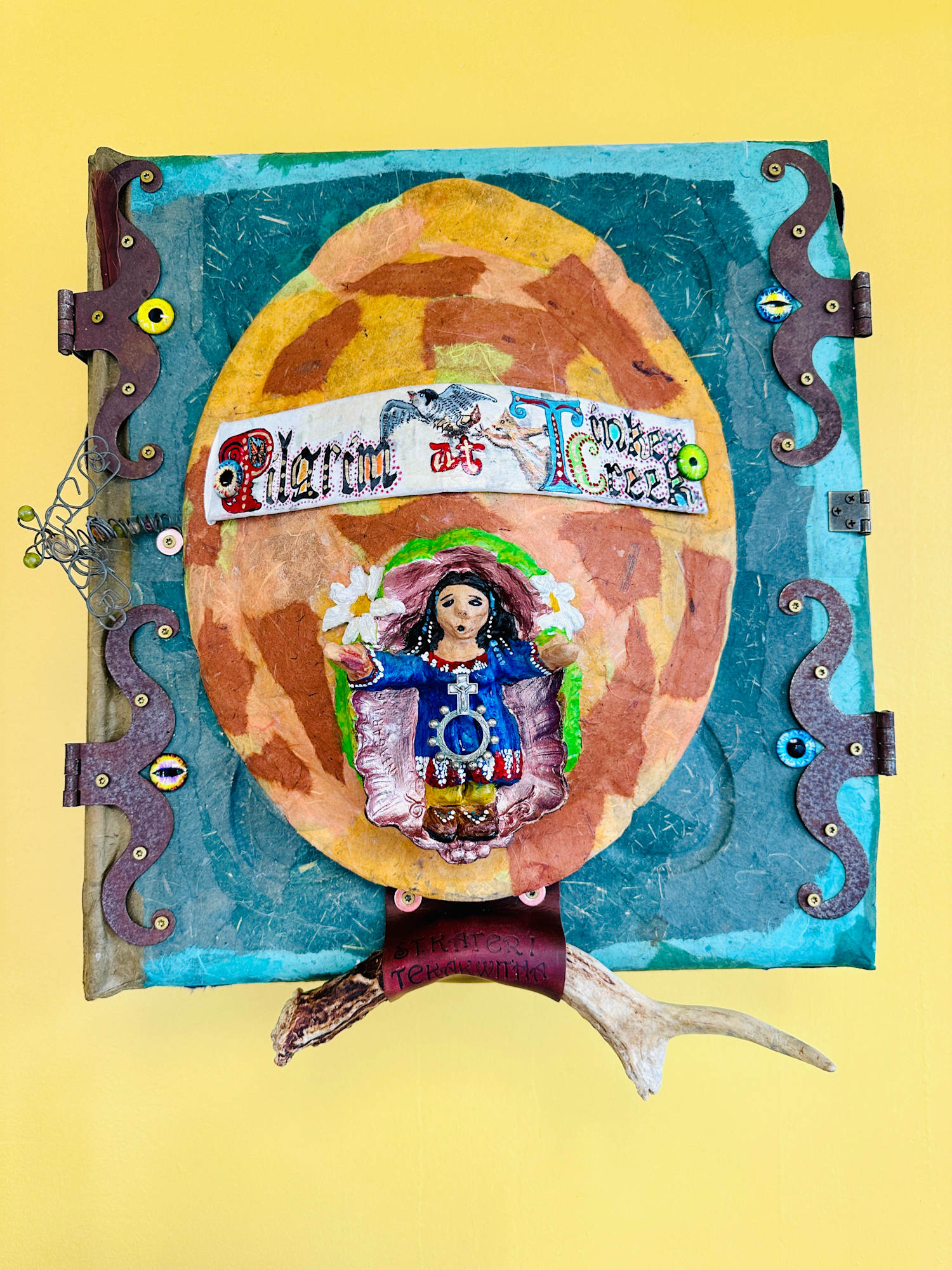 A “Cumdach,” a medieval Celtic book shrine dedicated to a saint traditionally serves to carry sacred texts or relics and is often permanently sealed. This artistic representation of a cumdach incorporates elements such as clay, leather, deer antler, and other found objects.