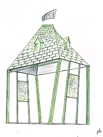 This piece is constructed of mild steel, wood, and marbles. Burr says, "I wanted to make a more contemporary structure that would still nestle into its location." The marbles decorate the back panel, catching rays of indirect sunlight. "Equally beautiful is the concept of the marbles signifying individuals standing together producing a powerful source of natural energy."