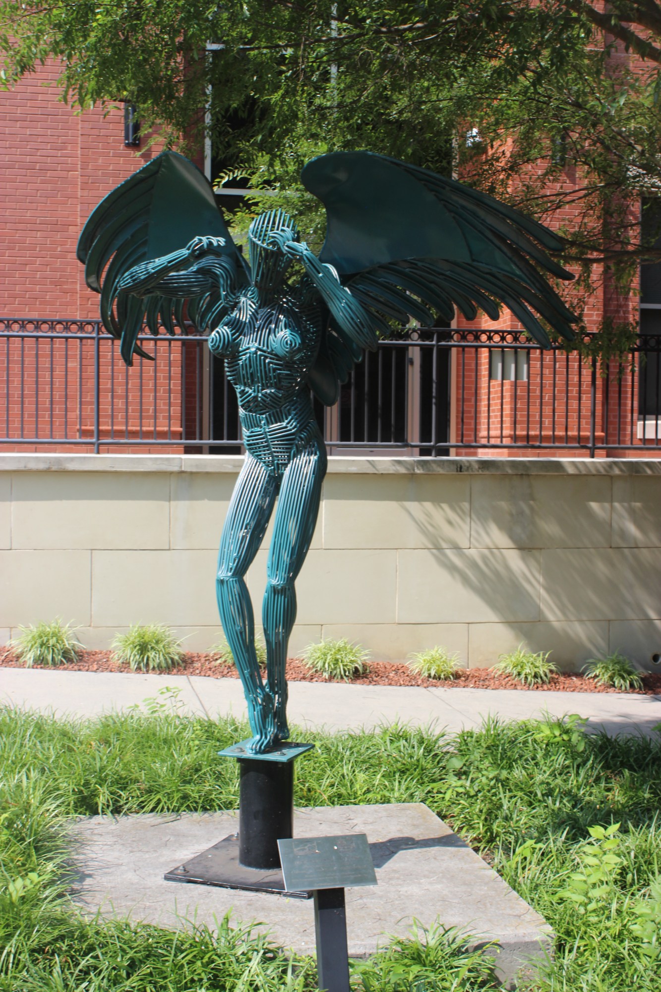 'Descending Night' is a public art sculpture done by artist Jack Howard-Potter. This sculpture depicts a winged female figure and is featured in the Elmwood Park Art Walk among many other works of public art . Potter took inspiration from the many works displayed at the Metropolitan Museum of Art and eventually sculpted 'Defending Night' out of steel. “Descending Night came out of my study of works from the Metropolitan Museum of Art’s collection and embodies the natural city theme in its depiction of a winged female figure. Artists have given human figures animal elements for thousands of years and bringing the natural non-human world into the arts allows us to explore our own feelings and alleviate the feeling of the modern cities in which we live and how they can feel constrained and overwhelming. This figure gives us hope that we can elevate ourselves to rise above the trappings of humanity and ascend into a more natural state of being.”