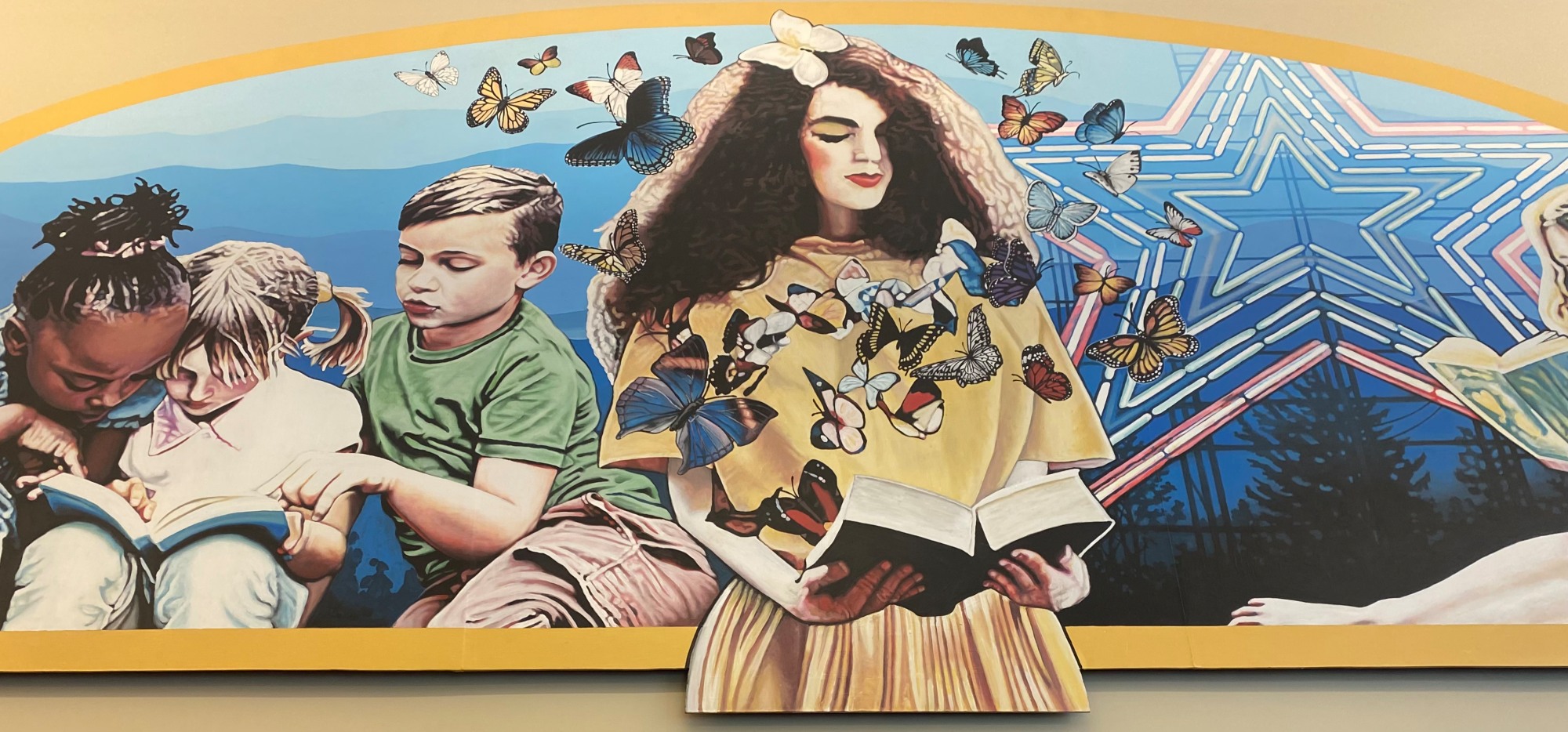 The piece titled 'Flight of the Imagination' is a public mural designed by artist Jaime Phillips. This piece is located at the Raleigh Court Branch Library and depicts several individual reading, making this the perfect location for the 'Flight of the Imagination' mural.