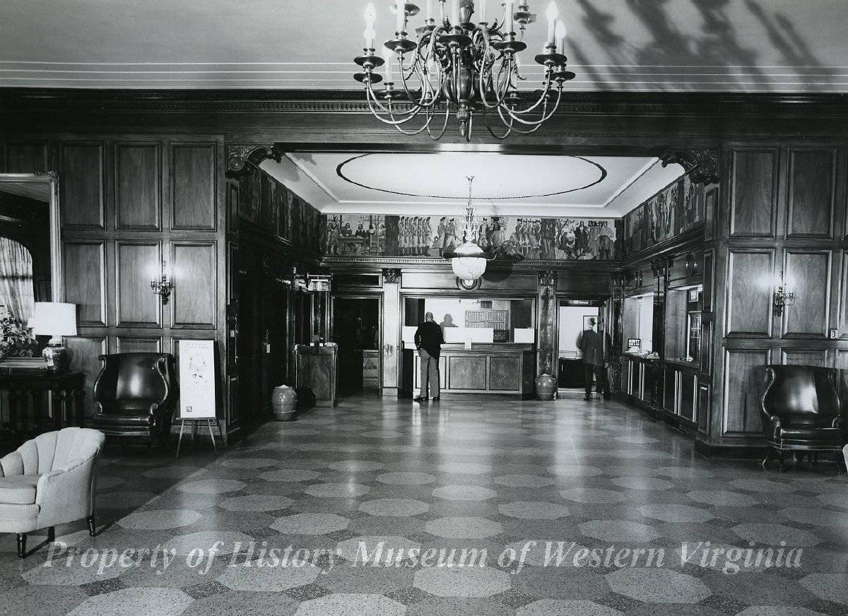 “The expansion of Hotel Roanoke during the late nineteenth century reflected the economic success of the Norfolk & Western railroad and the boom town prosperity of the city that headquartered that major steel rail era line” (National Register of Historic Places Registration Form: Hotel Roanoke 14). Both the Northeast Wing and West Wing were developed from this initiative, in the midst of the great depression. The West Wing, replacing “the 1890/1898 west or main wing,” was built by 1938 whereas the Northeast Wing was in 1931, which replaced the “the 1882 frame annex” that was there since 1916 (National Register of Historic Places Registration Form: Hotel Roanoke 15). In contrast to the Northeast Wing, which was described as representing “architectural continuity, civic pride, and interest in automobile tourism,” the West Wing was promoted as an “architecturally significant modern version of an old English inn” (National Register of Historic Places Registration Form: Hotel Roanoke 16). George B. Post & Sons was the firm in charge of the 1938 renovations design of the West Wing, and selected the “‘Georgian design’ of the Main Dining room, now the Regency Dining Room; the Palm Court, now the Oval Room: and the Grand Ballroom” (National Register of Historic Places Registration Form: Hotel Roanoke 17). They also included the new Peacock Alley and the Lobby within the hotel’s new wing. The firm chose “consultants of national stature to furnish and decorate the interior public spaces of the hotel: furnishings by Marshal Field and Company of Chicago; decorating of special rooms by Rambusch Decorating Company of New York City” (National Register of Historic Places Registration Form: Hotel Roanoke 17). They also selected artist Hugo Ohlms to paint the nine murals in the Lobby. Certain parts of the West Wing have been renovated since then, but most of its architectural integrity.