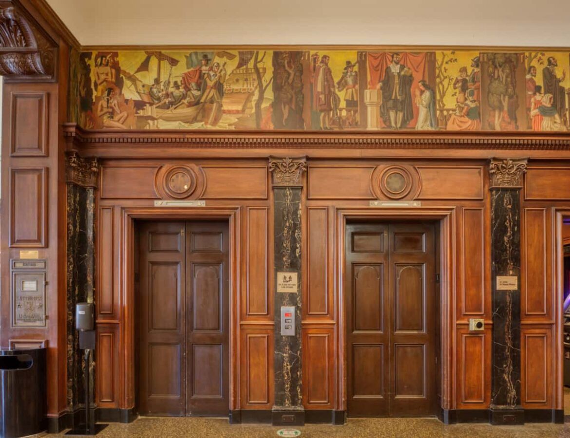 Found within the registration area of the Lobby along the upper wall is a series of painted canvas panels. This mural was created in 1938, by artist Hugo Ohlms. Ohlms was “selected to paint nine murals in the Lobby that depicted colonial era Tidewater scenes from the landing at Jamestown to the surrender of Cornwallis at Yorktown” (National Register of Historic Places Registration Form: Hotel Roanoke 17). These panels depict scenes from Virginia’s colonial history such as The Landing at Jamestown 1607, Baptism of Pocahontas, Marriage of Pocahontas, The First Representative Government in America 1619, The Surrender of Lord Cornwallis at Yorktown 1781, William and Mary College, Patrick Henry's Address 1765, Women arrive at Jamestown 1619, and Virginia Hospitality.