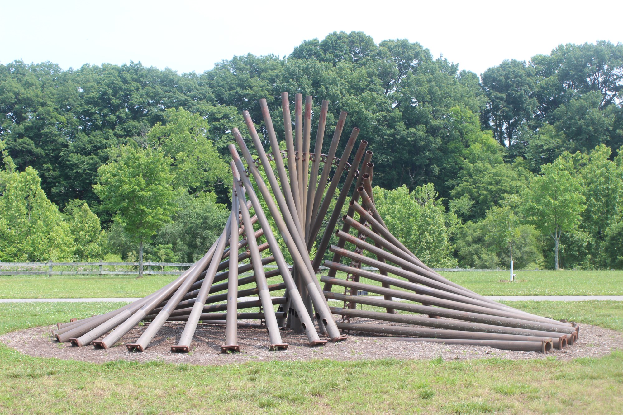 'In Flux' is a permanent public art sculpture created by artists, Matt Rink and Bland Hoke. This piece was constructed using 39 decommissioned lamp posts. Hoke and Rink call their piece “a constantly evolving work that adapts to its current landscape.” Since 2006 they have focused on creating a body of work utilizing 100 decommissioned lamp poles. Originally a part of the second installment of the Art in Roanoke (AIR) temporary exhibition from September 2010 to March 2012, "In Flux" became a permanent installation in 2012. This sculpture is located in Vic Thomas Park, which lies along the Roanoke River Greenway.